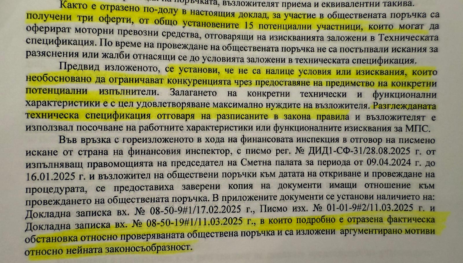 Твърденията на народния представител от ППДБ за манипулирана поръчка, нагласена за един участник, се опровергават от доклада на АДФИ: “За участие в обществената поръчка са получени 3 оферти, от общо установените 15 потенциални участници, които могат да оферират моторни превозни средства, отговарящи на изискванията заложени в Техническата спецификация”… И още: “Предвид изложеното се установи, че не са налице условия или изисквания, които необосновано да ограничават конкуренцията чрез предоставяне на предимство на конкретни потенциални изпълнители. Разглежданата техническа спецификация отговаря на разписаните в закона правила.” Заключенията на АДФИ са същите като на АОП.