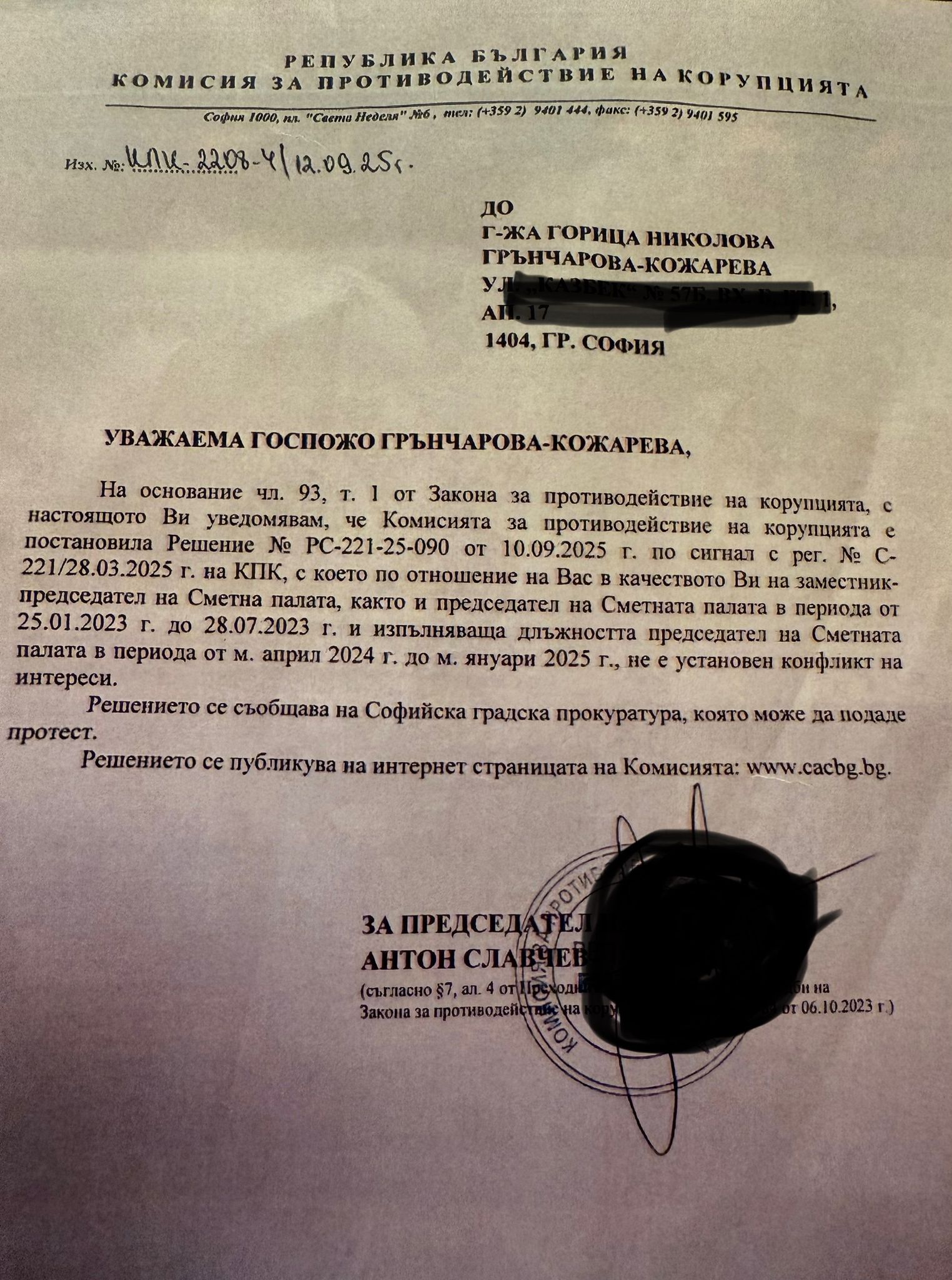На основание чл. 93, т. 1 от Закона за противодействие на корупцията, с настоящото Ви уведомявам, че Комисията за противодействие на корупцията е постановила Решение Nº PC-221-25-090 от 10.09.2025 г. по сигнал с рег. Nº С-221/28.03.2025 г. на КПК, с което по отношение на Вас в качеството Ви на заместник-председател на Сметна палата, както и председател на Сметната палата в периода от 25.01.2023 г. до 28.07.2023 г. и изпълняваща длъжността председател на Сметната палата в периода от м. април 2024 г. до м. януари 2025 г., не е установен конфликт на интереси.