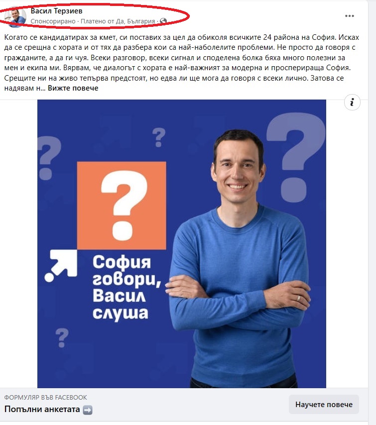 Във Фейсбук на произволни граждани излиза реклама със снимка на Васил Терзиев и текст: "София говори, Васил слуша." Най-отгоре пък се появява информация, че постът е спонсориран, тоест платен от "Да, България".