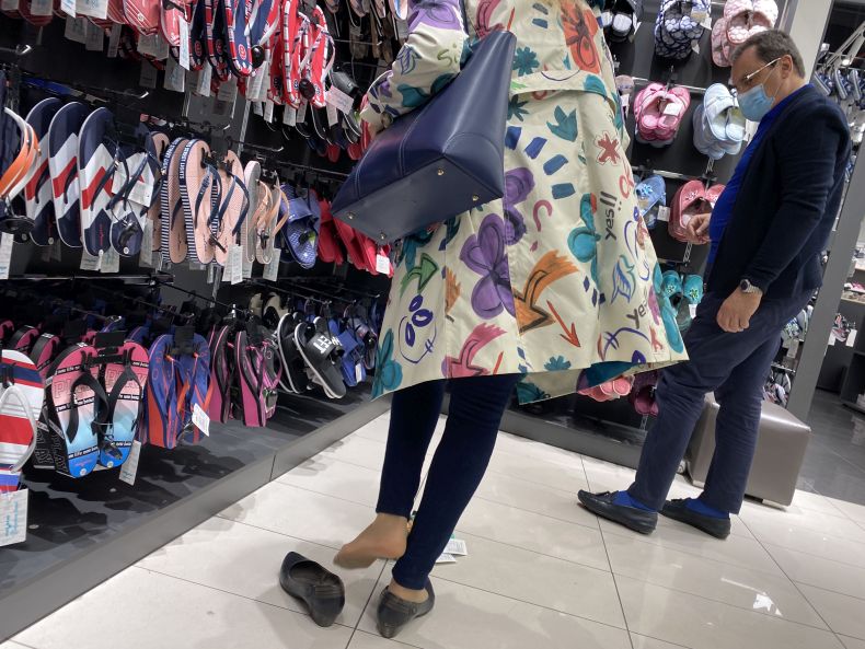 И понеже към морето не се тръгва без джапанки, Орешарски най-напред се обзаведоха с гумени чехли за плажа. Семейството избра българското и заложи на популярен роден бранд за обувки. Елка си хареса цветни джапанки, но преди да направи покупката, първо ги пробва, за да се увери, че са удобни.