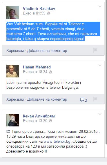 "Теленор се срина... Към този момент 28.02.2015г. 13:29 часа Българско време няма достъп до официалния сайт на www.telenor.bg .Обадих се до оператора на 123 и ми затворила разговора :) доверието е взаимно!!!", написа вчера Кенан Алиибрям.