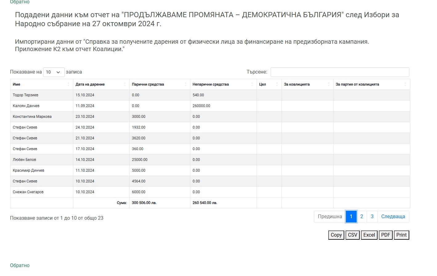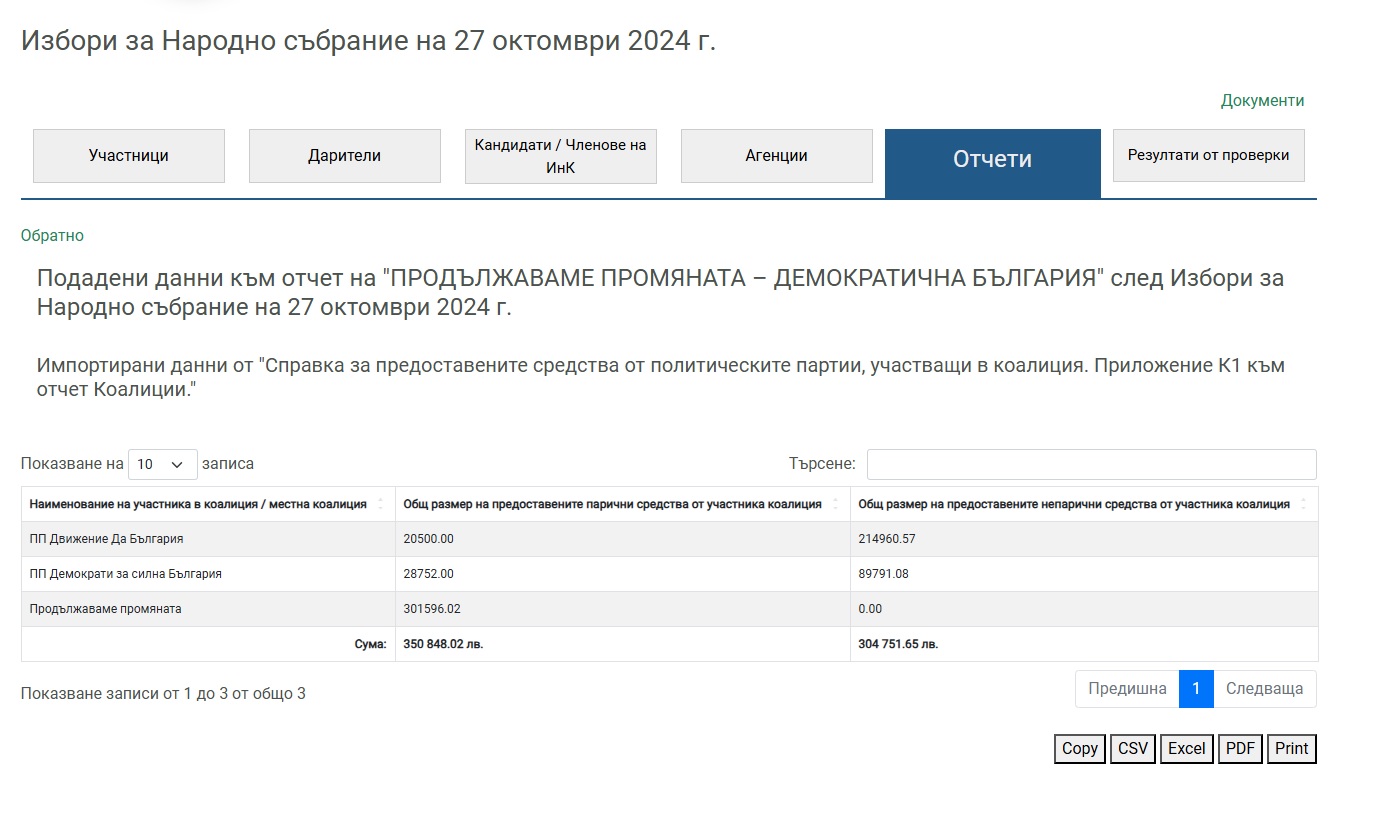 От разбивката се вижда, че "Да, България", ДСБ и "Продължаваме промяната" са дали от партийните си каси общо 350 848.02 лв. парични средства. Голяма част от тях идват от "Промяната", която се е бръкнала с малко над 300 бона. За сметка на това "Да, България" са допринесли за коалицията с 214 960.57 лв. под формата на непарични средства. ДСБ прибавят още 89 791.09 лв. под формата на непарични средства.