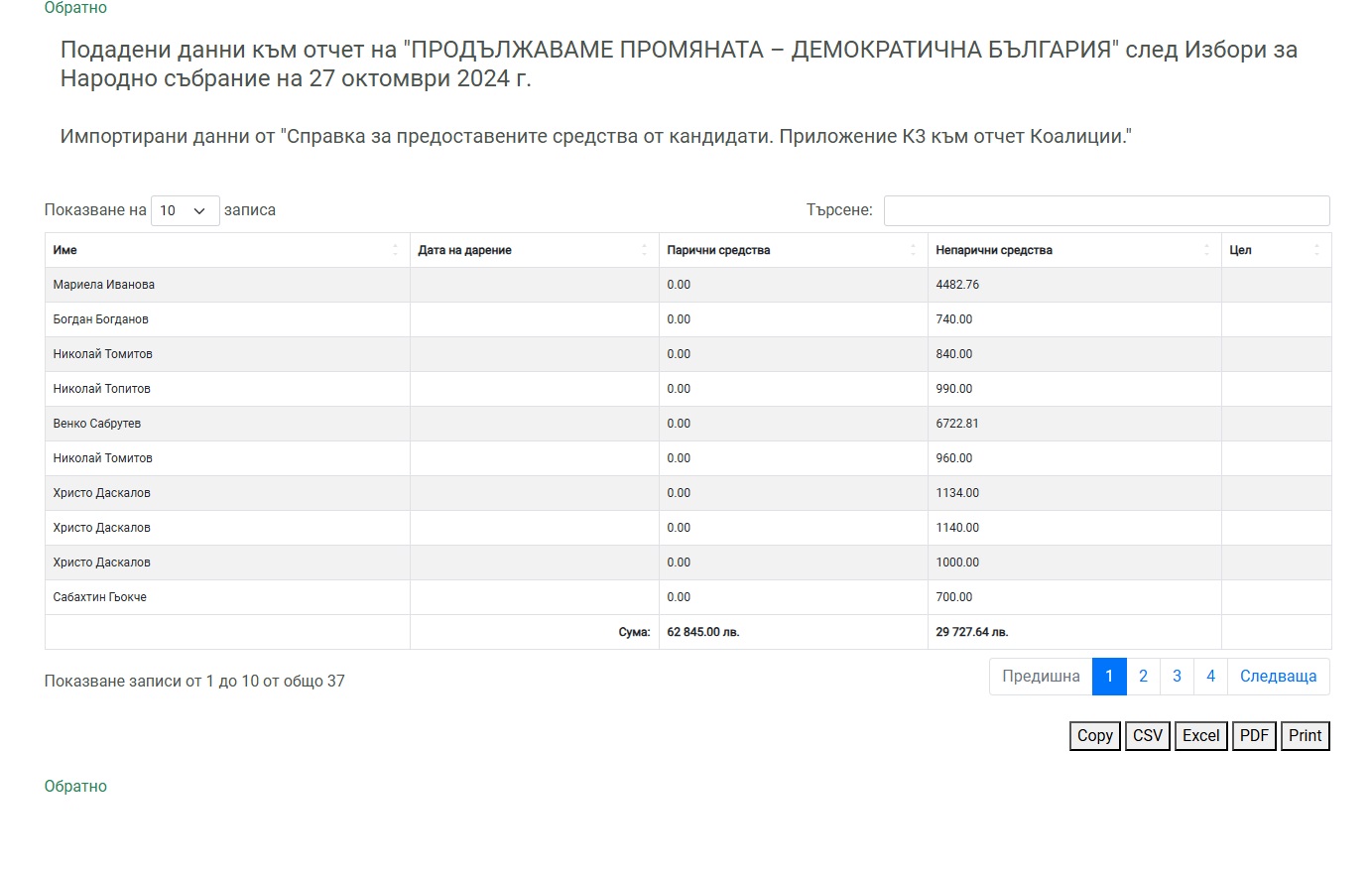 Справката с даренията на кандидат-депутатите от ППДБ разкрива, че дарените парични средства са в размер на 62 845 лв., а на непаричните - 29 727.64 лв. Това прави общо 92 572,64 лв.