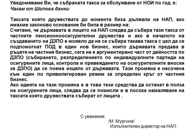 Още през 2006 г. държавата е отменила разпоредбата отнасяща се до плащане на такса обслужване от пенсионно осигурителните дружества. Това става ясно от документ изпратен от шефката на НАП Мария Мургина до тогавашния финансов министър Пламен Орешарски.