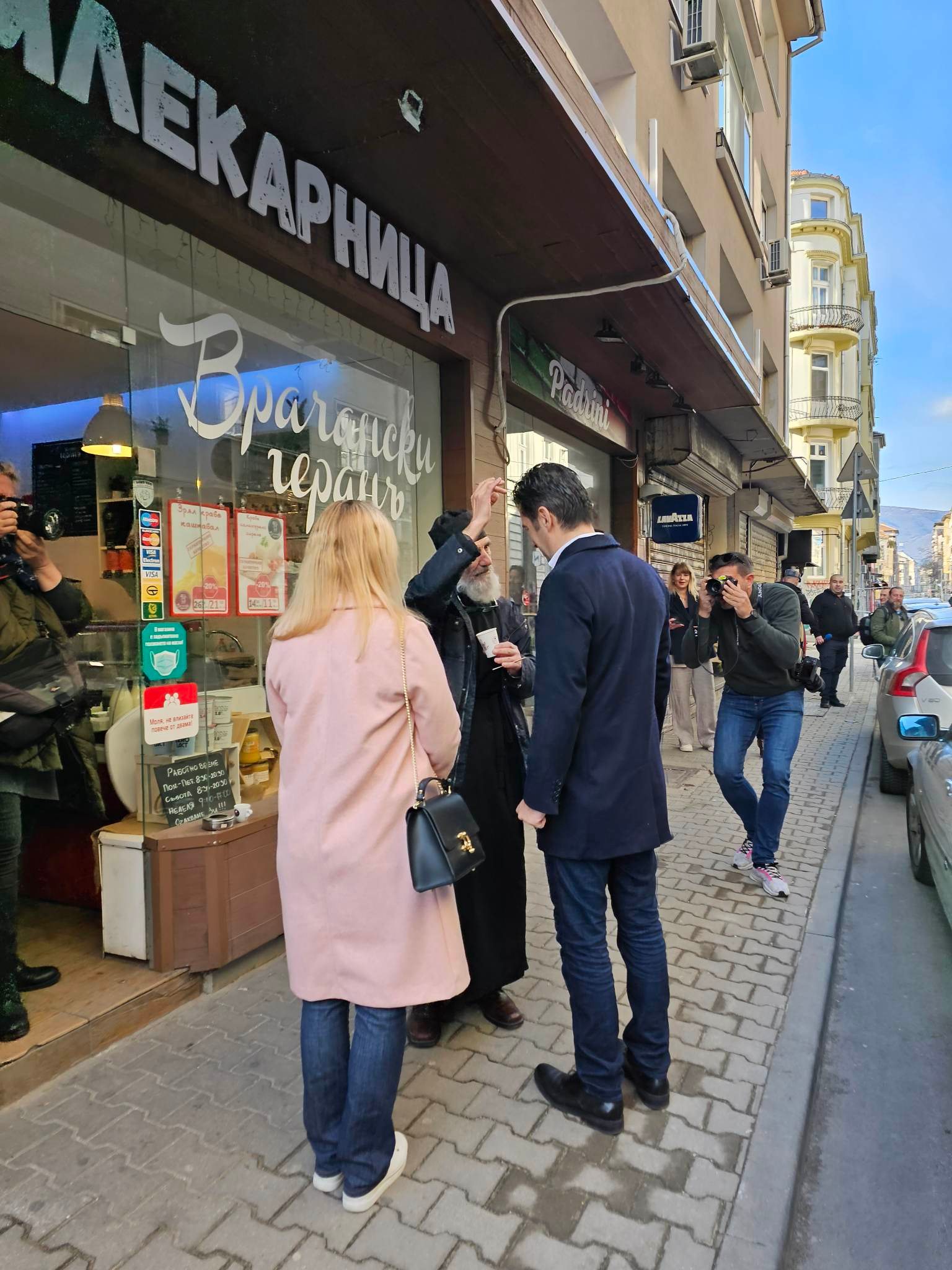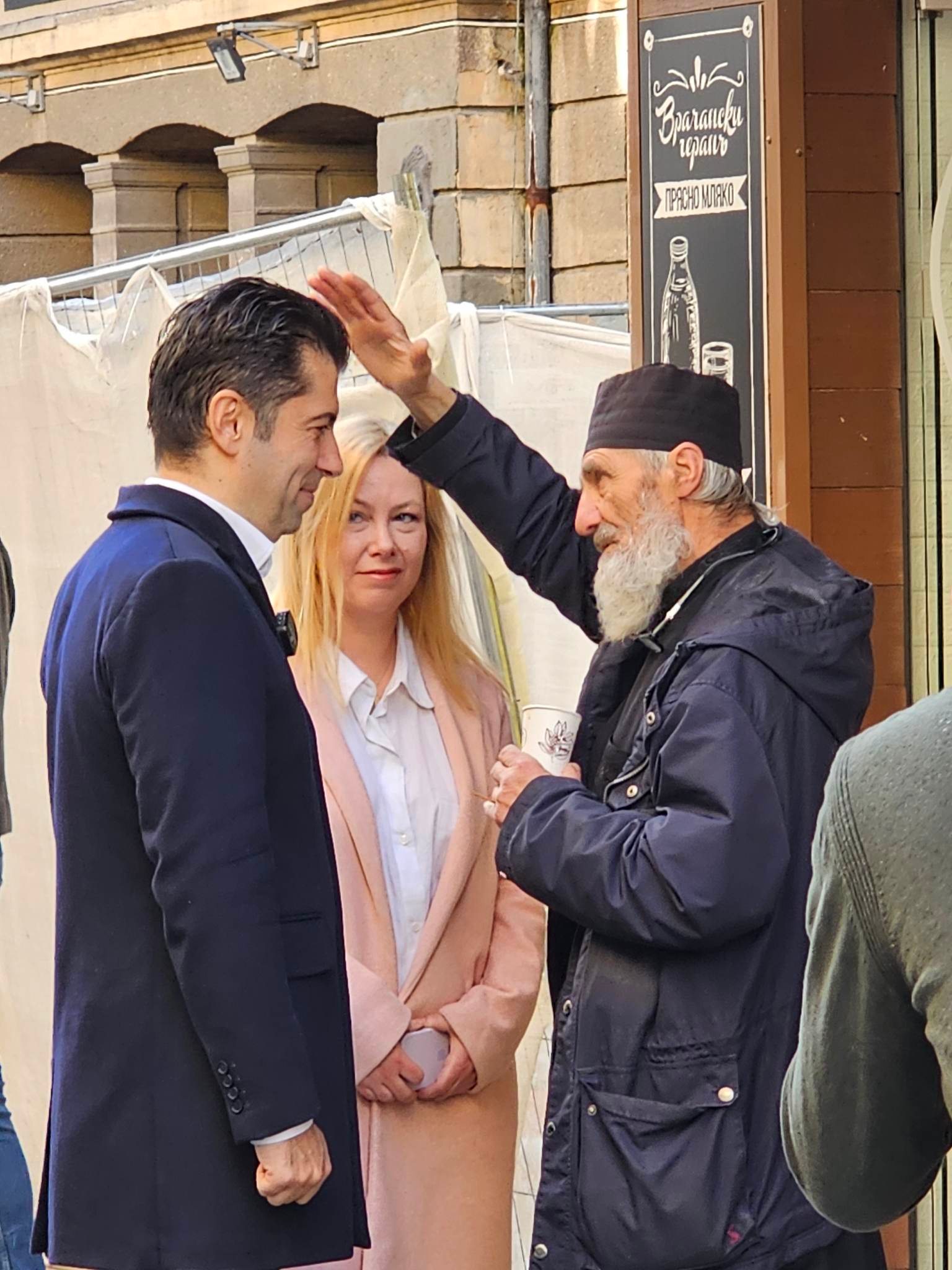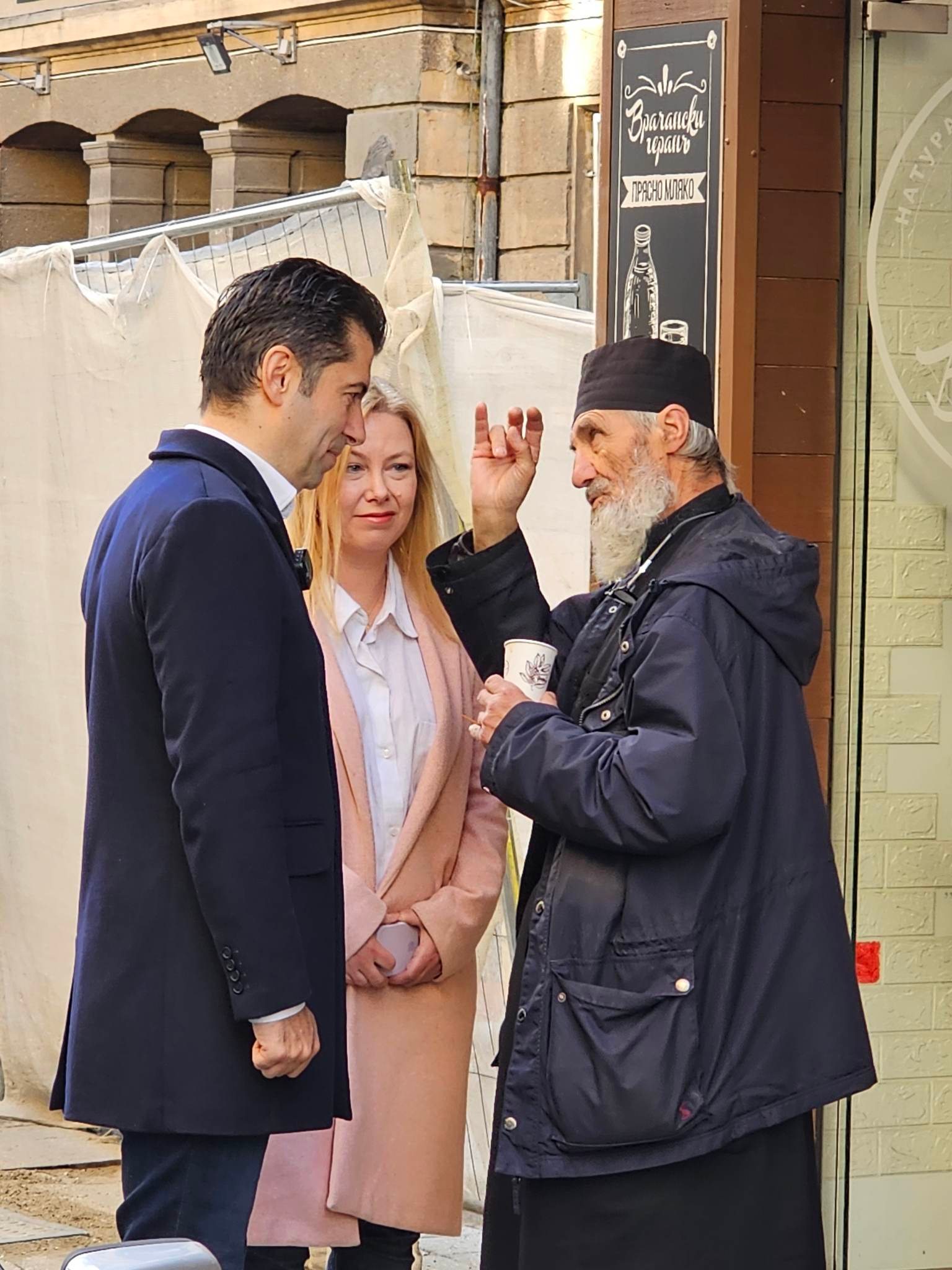 В неделната утрин, малко след 9 ч., в колкото гласува в 133-то СОУ "Александър Пушкин", Петков и жена му Линда се натъкнаха на поп на улицата, а срещата им бе заснета от фотографите на ПИК.