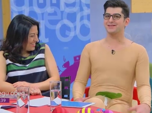 Актьорът Сашо Кадиев лъсна "гол" в ефира на Би Ти Ви. Дибидюсът на водещия беше малко камуфлажен все пак. Той се появи в студиото на живото предаване облечен в майо с телесен цвят и зелен лист на интимните си части.