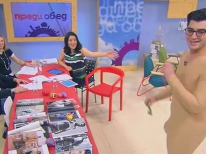Сашо Кадиев миналата седмица обеща да води „Преди обед" чисто гол в понеделник, подкокоросан от журналистката Кристина Патрашкова, която бе гост-коментатор в предаването. Синът на Катето Евро изрази възхищението си от скандалното видео с американците, работили цял месец голи в офиса, което обиколи социалните мрежи.