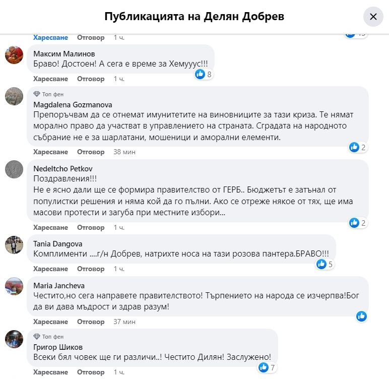 Почитатели на Делян Добрев в социалната мрежи побързаха да го поздравят за победата. Сред коментарите под публикацията му имаше и доста екзотични честитки, като, например, тази: "Комплименти... г-н Добрев, натрихте носа на тази розова пантера".