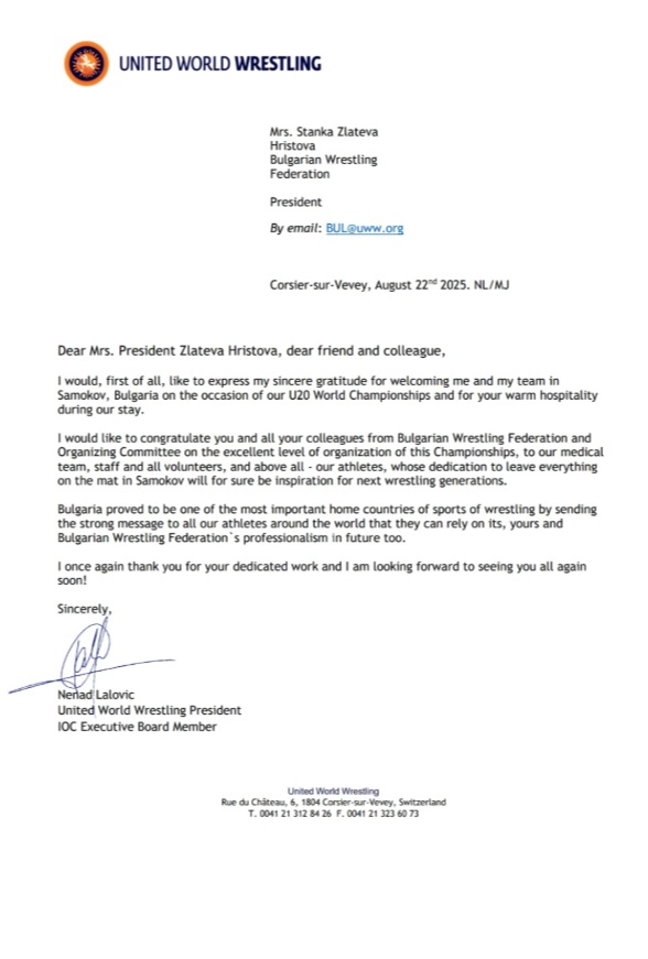 „България доказа, че е една от най-важните родини на спорта борба, като изпрати силно послание към всички наши състезатели по света, че могат да разчитат на нейния, Вашия и на Българската федерация по борба професионализъм и занапред“, се казва в поздравителния адрес на Ненад Лалович до председателя на БФ Борба Станка Златева след края на световното първенство за юноши в Самоков. Лалович бе гост на шампионата и даде старт на 8-дневната надпревара, в която стартираха 650 състезатели от 70 държави.