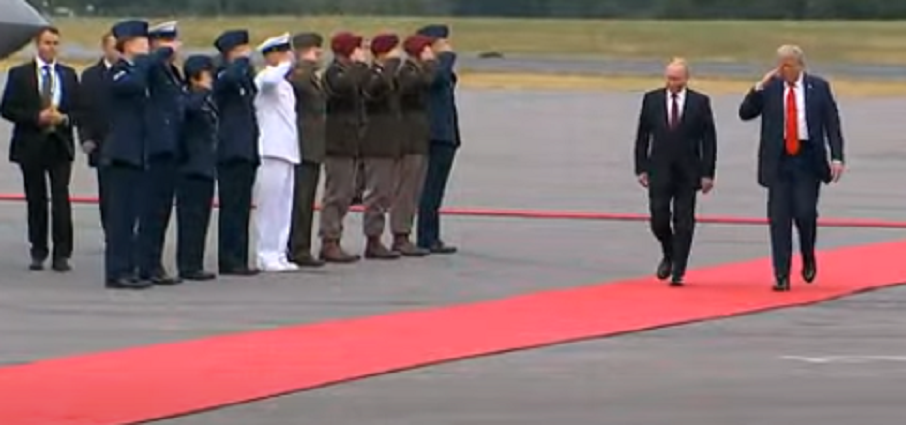 Първият, който слезе от самолета, беше Доналд Тръмп, който приветства Путин на червения килим. Докато Тръмп и Путин се срещаха, над тях прелетя почетна група американски изтребители и бомбардировач B-2.