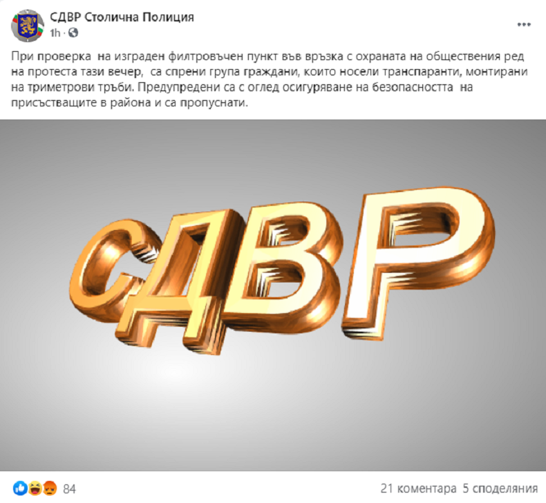 При проверка на изграден филтровъчен пункт във връзка с охраната на обществения ред на протеста тази вечер, са спрени група граждани, които носели транспаранти, монтирани на триметрови тръби. Това съобщиха от СДВР.