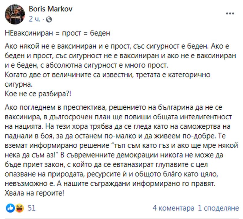 "Решението на българина да не се ваксинира, в дългосрочен план ще повиши общата интелигентност на нацията. На тези хора трябва да се гледа като на саможертва на паднали в боя, за да останем по-малко и да живеем по-добре. Те вземат информирано решение “тъп съм като гъз и ако ще мре някой нека да съм аз!” това написа в профила си във "Фейсбук" седесарят Борис Марков. Според него неваксиниран е равно на прост и беден.