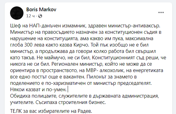 Седесарят Борис Марков: Президентът назначи за шеф на НАП данъчен измамник, за здравен министър - антиваксър, начело на МВР - алкохолик. ТЕЛК за вас, избиратели на Радев