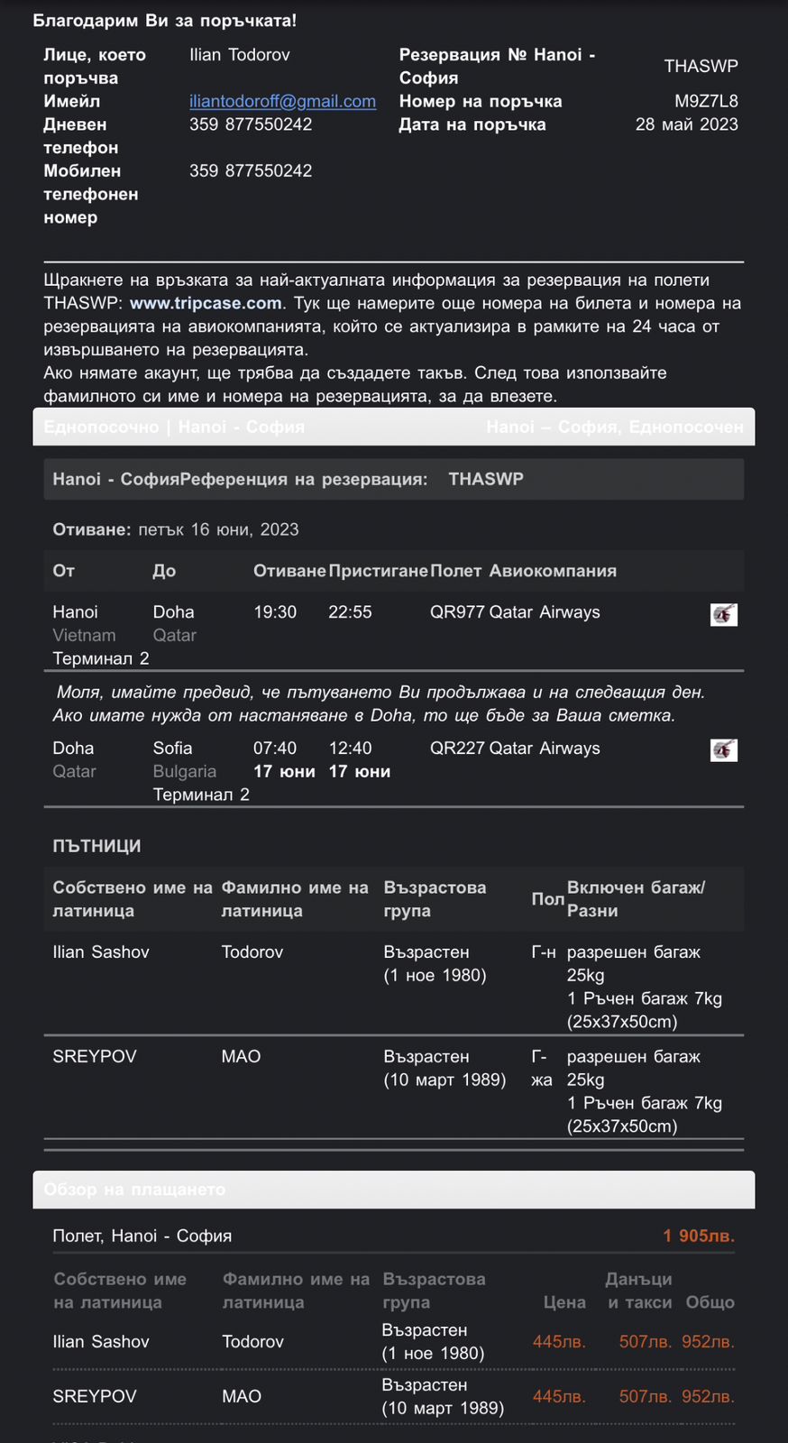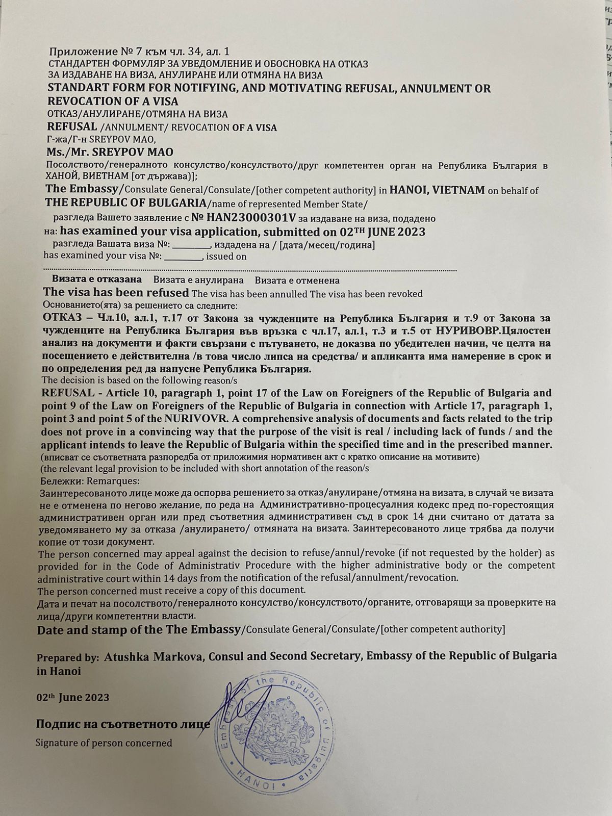 Ходенето по мъките продължило и след като приятелката на Тодоров представила двупосочен билет. Вазита била отказана от консула ни в Ханой Атушка Маркова с основание, че липсват доказателства по убедителен начин, че целта на посещението е действителна и чужденката има намерение да напусне България в определения от закона срок.