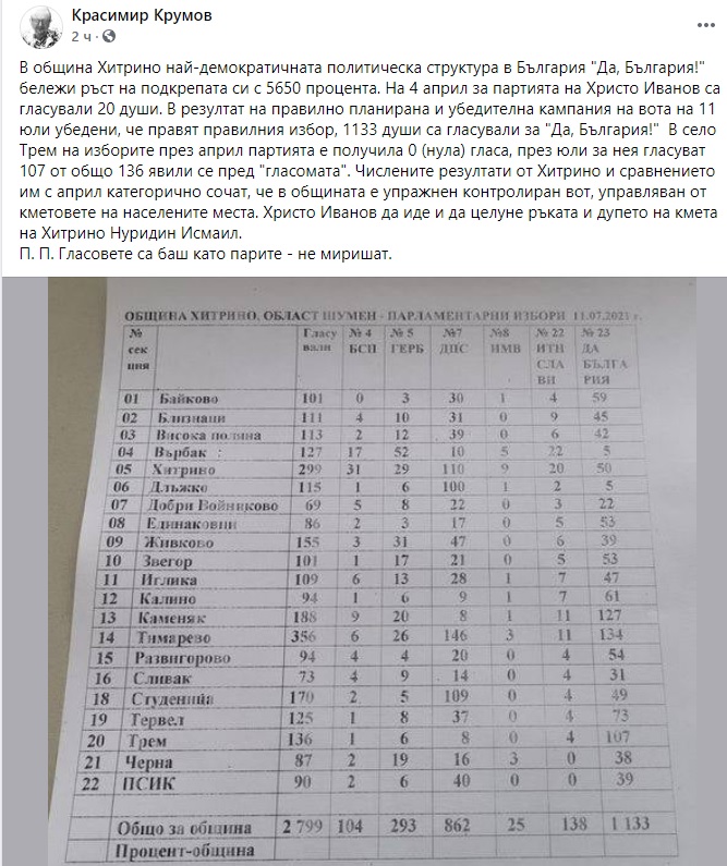 Числените резултати от Хитрино и сравнението им с април категорично сочат, че в общината е упражнен контролиран вот, управляван от кметовете на населените места. Христо Иванов да иде и да целуне ръката и дупето на кмета на Хитрино Нуридин Исмаил.