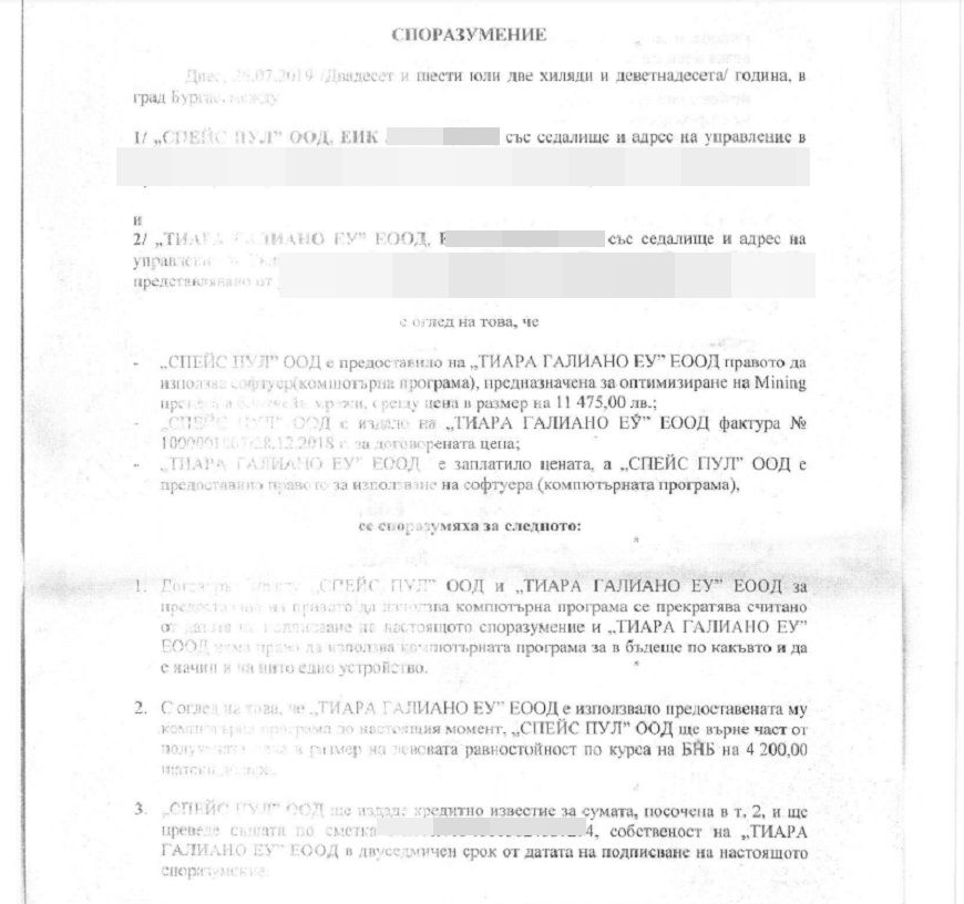 През лятото на 2019 г., след многократни разговори между двамата, Константин Бачийски казал, че е съгласен да сключат споразумение и да върне част от парите за неработещите софтуери. Споразумението било сключено при нотариус, като на собственика на фирмата били възстановени парите за първите 15 лиценза, за които имал фактура. За вторите 10 лиценза, за които заплатил с биткойни, не получил плащане.