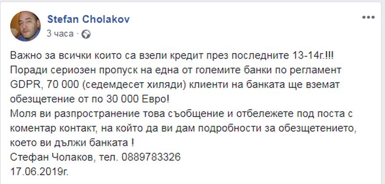 Проверка на агенцията ни показа, че такъв профил наистина съществува, а постът е повече от скандален. Хората пък наистина се хващат на въдицата и с охота споделят свои лични данни, с надеждата да им бъдат върнати някакви несъществуващи пари. Уловката пък е повече от добра, зарибяват се такива, които имат кредити или с други думи всеки втори българин. Постът на Чолаков пък е започнал да се разпространява мълниеносно, като вероятно причината е кражба на лични данни.