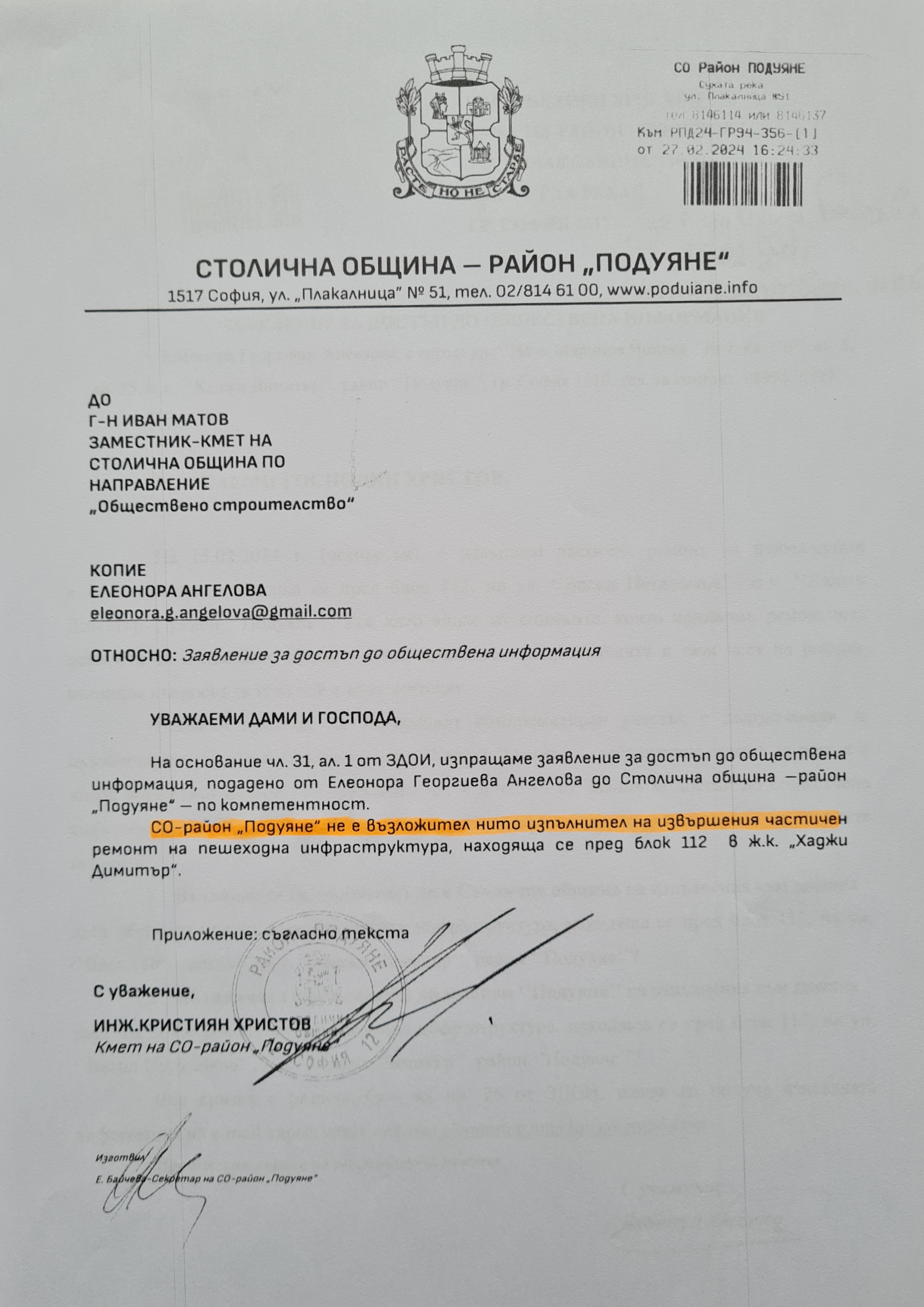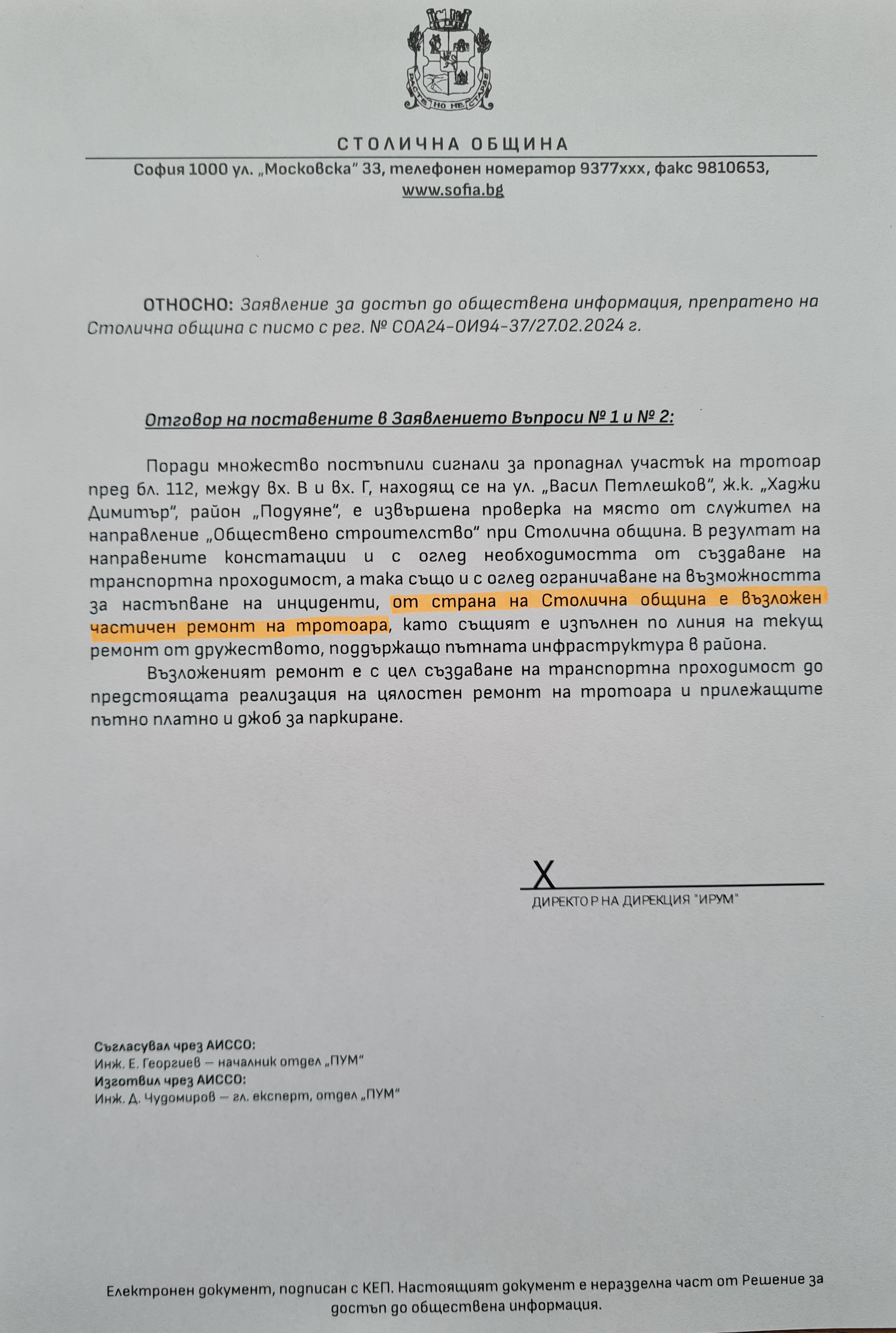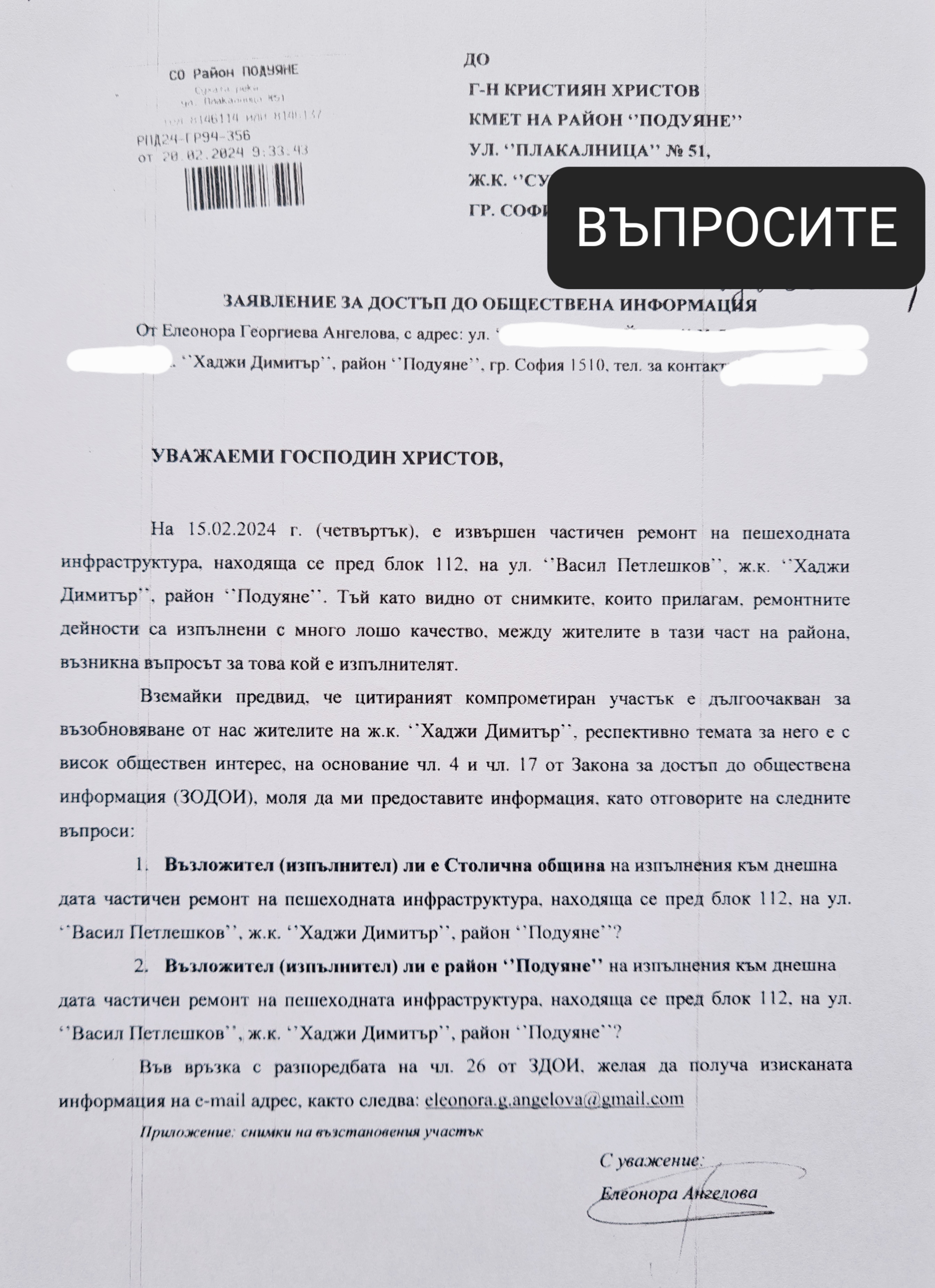 Вземайки предвид, че цитираният компрометиран участък е дългоочакван за възобновяване от нас жителите на ж.к. ‘’Хаджи Димитър’’, като в тази връзка многократно сме го предлагали за ремонт с изтегления заем за тротоари от Европейската инвестиционна банка, така също и за включване в Бюджета на СО за 2024 г., но г-н Терзиев не прие предложението, подадохме заявление за достъп до обществена информация със следните въпроси: