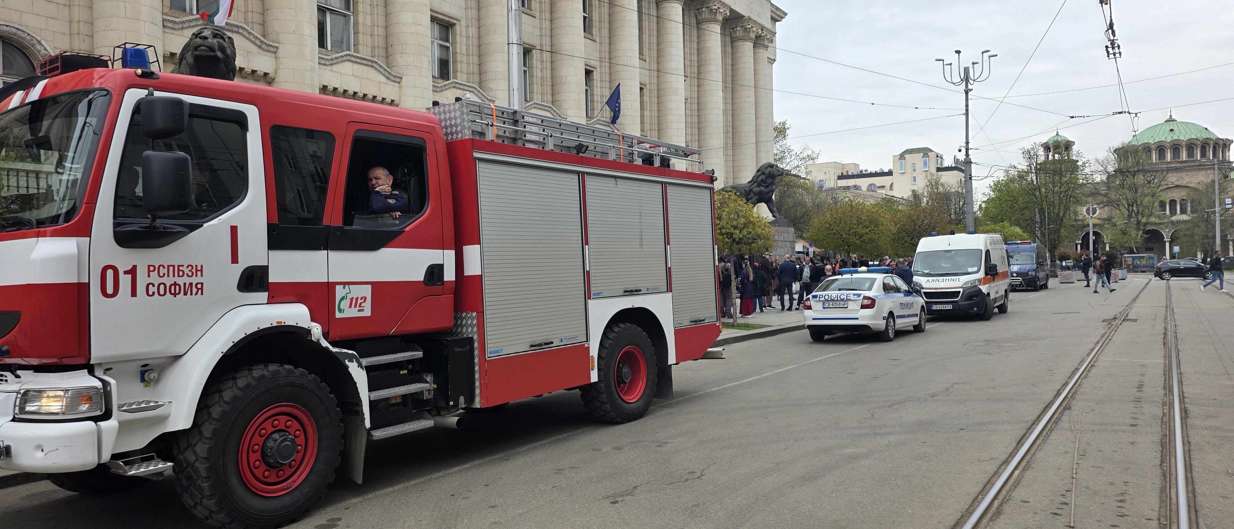 На място са пристигнали екипи на полицията и пожарната, а служителите са евакуирани от сградата.