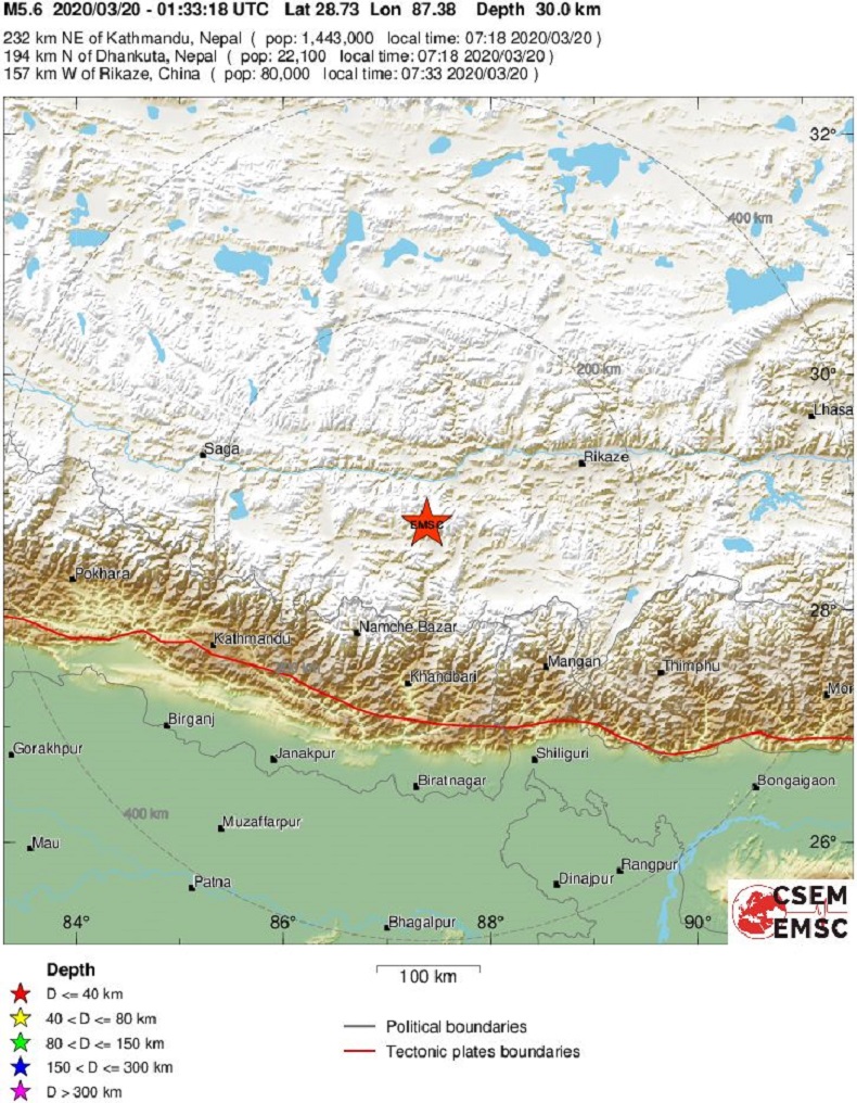 Трусът е бил регистрирани в 9:33 местно време в окръг Тингри. Епицентърът на земетресението е на дълбочина от 30 километра.
