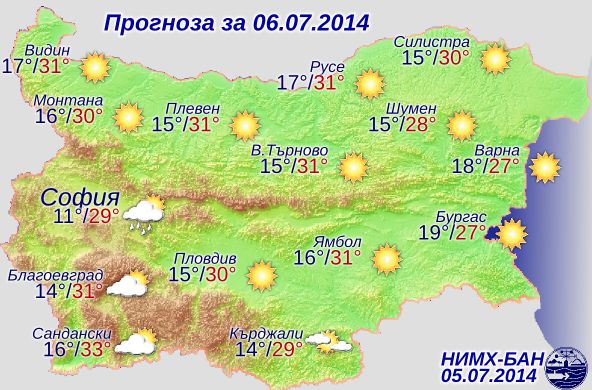 Температурите ще се повишат още и максималните ще са между 28° и 33°. В София – около 29°. Атмосферното налягане ще е около средното за месеца и ще остане без съществен дневен ход.