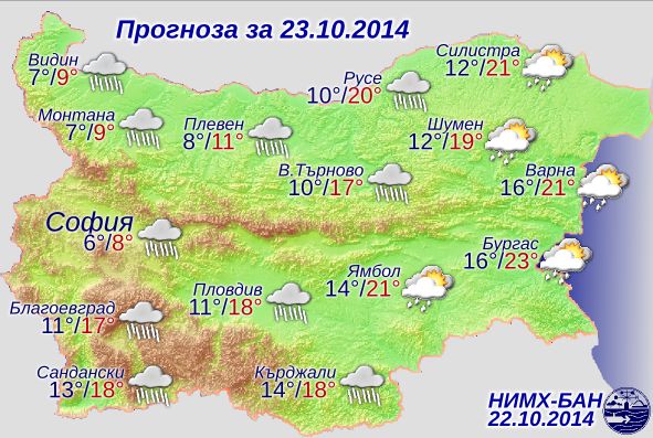 През следващото денонощие ще настъпи съществена промяна на времето. През нощта с умерен до силен вятър от северозапад ще нахлува студен въздух. Облачността ще се увеличи и в западните райони и Родопската област ще завали дъжд. В югоизточната половина от страната ще духа умерен и силен южен вятър. Минималните температури ще са от 5-6° в крайните западни, до 15-16° в югоизточните райони, в София около 6°.