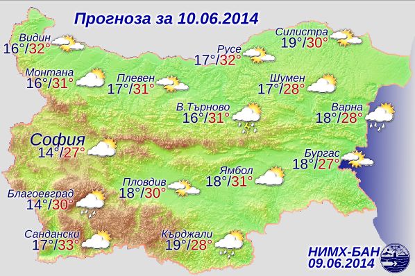 Времето ще е топло, с максимални температури между 27° и 33°, в София 27°. Атмосферното налягане ще остане по-високо от средното за месец юни; в следобедните часове слабо ще се понижи.