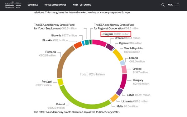"Освен АзБ и USAID, друг голям грантодаващ в България е EEA and Norway Grants. Според собствената им графика, те са раздали 2,8 млрд евро грантове - 210 милиона от които в България", пише на страницата си във "Фейсбук" журналистът Виктор Блъсков.