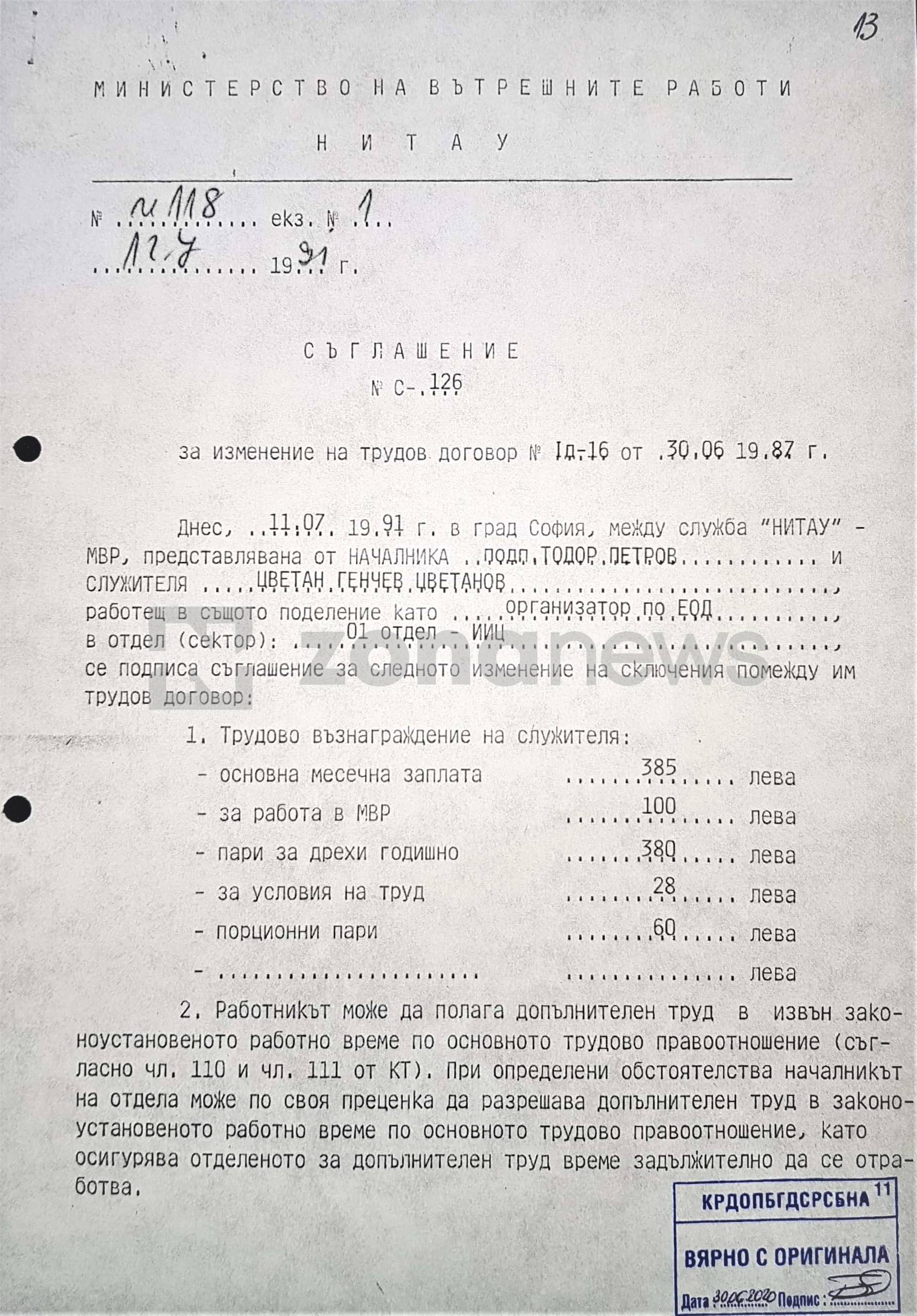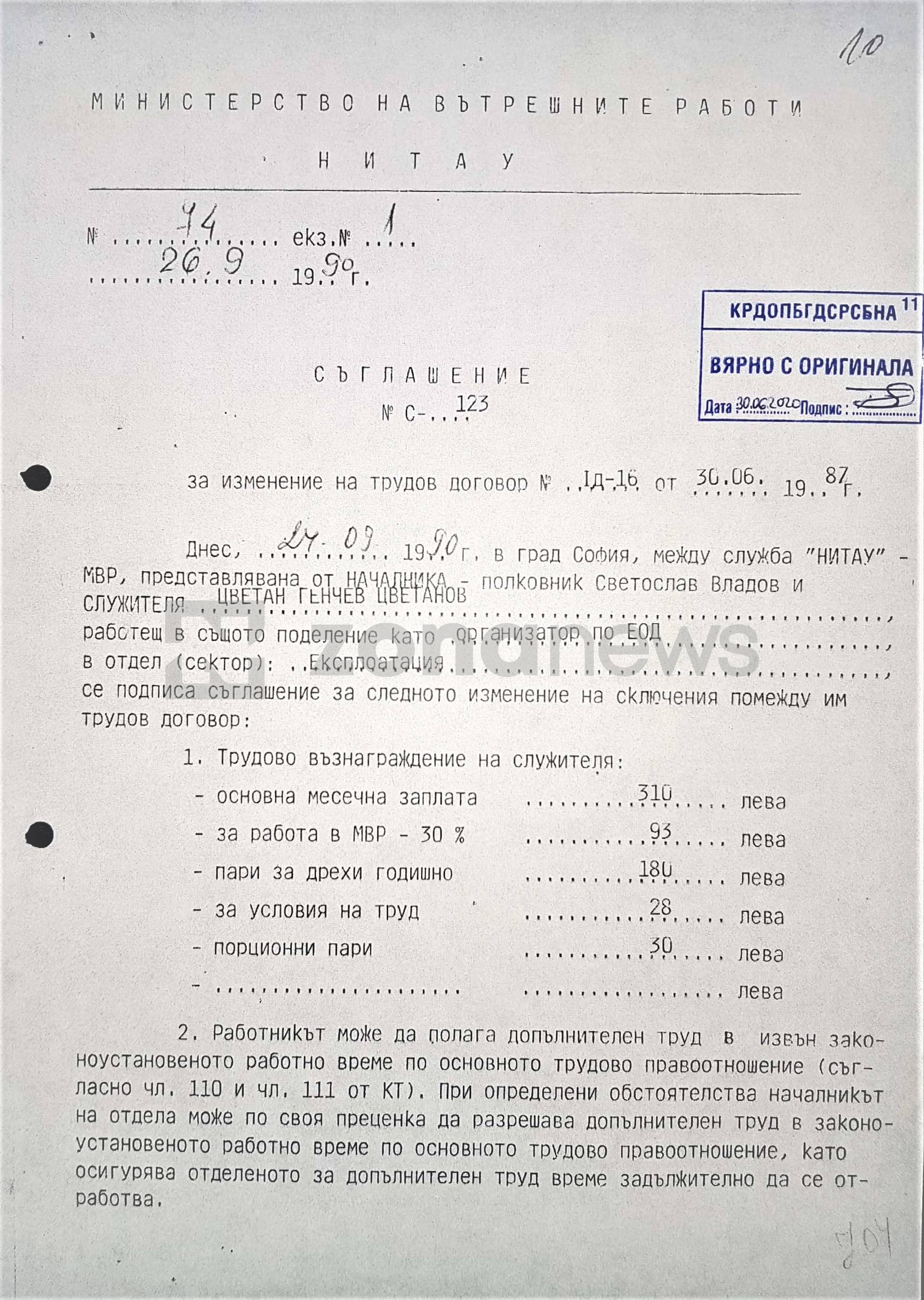 На върха на Седмо управление на ДС (ЦИОУ) дълги години - от 1979 до 1990 г. - е ген. лейтенант Васил Георгиев, комунистически престъпник от Сливен, член на РМС, осъден преди 9 септември 1944 г. на 10 г. затвор за терористична противодържавна дейност. Това е началникът на Цветанов от 1987 до 1990 г. Останалите документи, които четете като част от неговото лично кадрово дело са обикновени съглашения, описващи промяната в позицията и финансовото му доволствие, ако използваме отвратителния сленг на милиционерщината, както и заповеди за допълнителни финансови възнаграждения. След промените факторът, издигнал Цветан Цветанов от шофьор и оператор на ЕИМ в системата "СКРЕЧ" към ЦИОУ-ДС до служител на отдел "Човешки ресурси" в МВР, се казва Александър Петров, след доста години шеф на кабинета на Румен Петков.