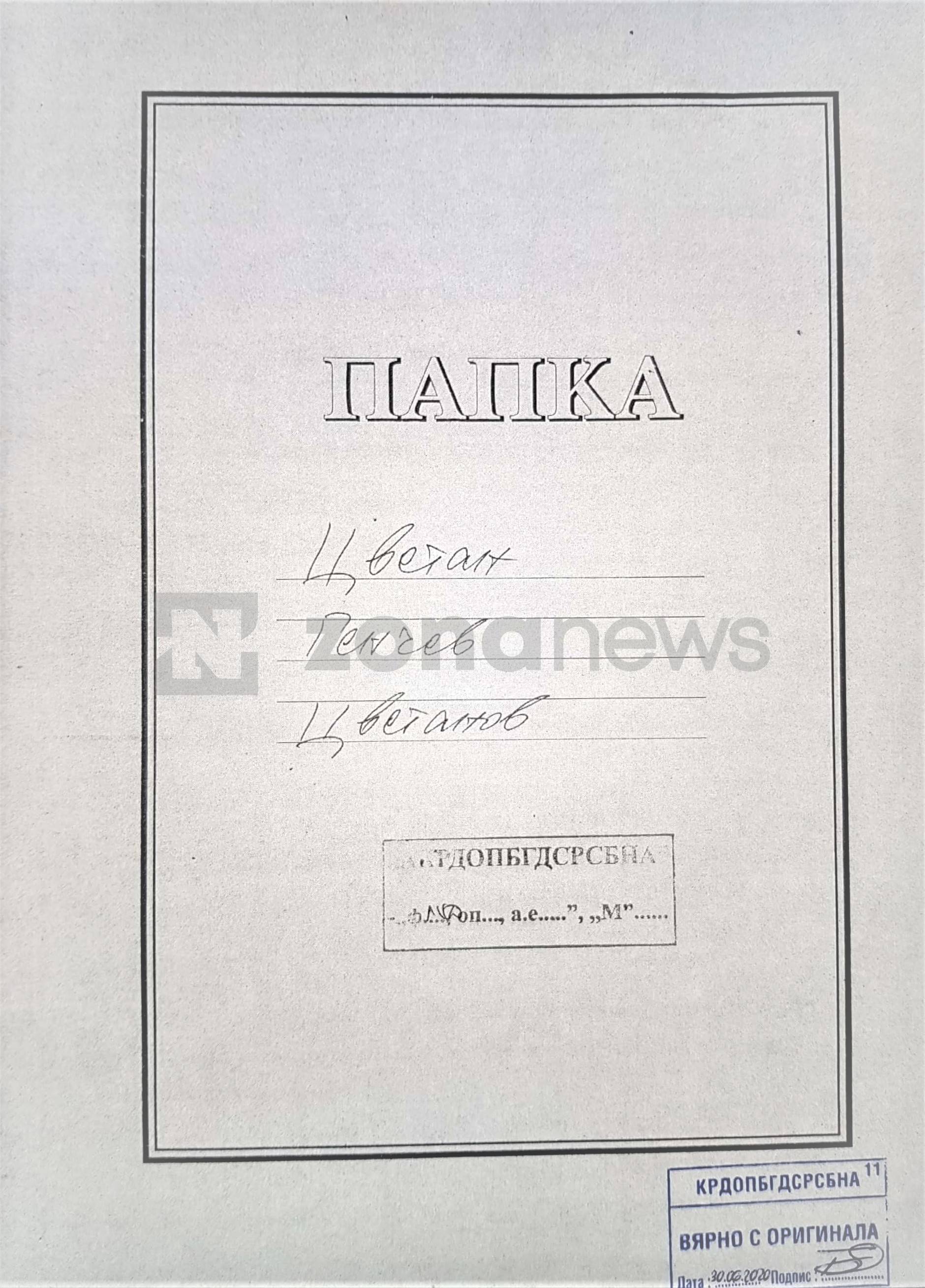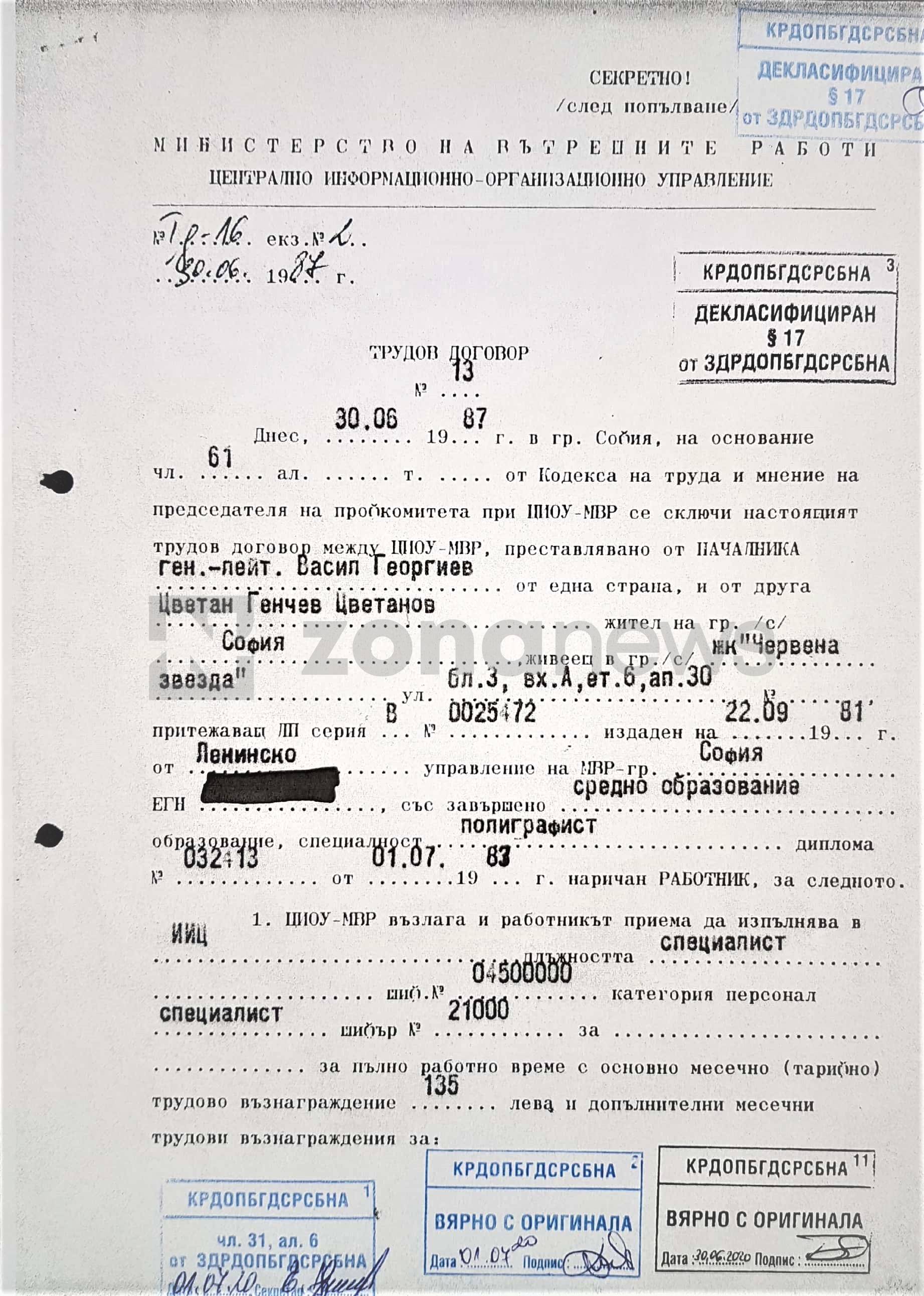 Цветанов обаче е бил волнонаемен служител на Седмо управление на Държавна сигурност, известно като ЦИОУ - Централно информационно-организационно управление на ДС. В архива на Комисията по досиетата се съхранява Лично кадрово дело (ЛКД) на Цветан Генчев Цветанов, в което са останали 12 листа. Виждате първото факсимиле от това ЛКД, където на корицата му е написано точно това - ЛКД, или лично кадрово дело. Ясно е, че става дума за волнонаемен, а не щатен служител по смисъла на § 1 т.2 от ДР на Закона за досиетата. Да, Цветанов никога не е работил като оперативен работник в ДС, но е бил на длъжност, която е част от номенклатурното разписание на Седмо управление на ДС. Иначе нямаше да има лично кадрово дело.