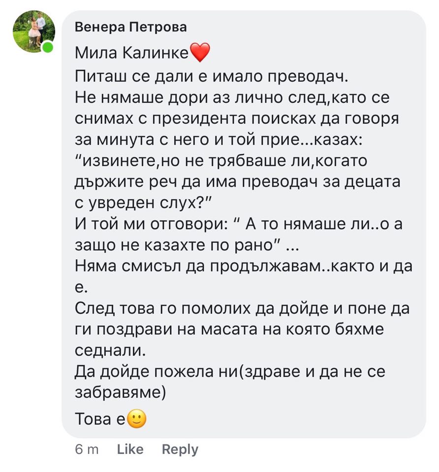 П.С: Надявам се на това събитие да е имало и специален преводач за децата със слухови увреждания, защото ако е нямало, е тотална липса на уважение. А когато президентът държи реч за преследване на мечти и избори, не е лошо пр-ите му да го запознават в детайли пред кого ще говори - може вече да са ги постигнали и направили.