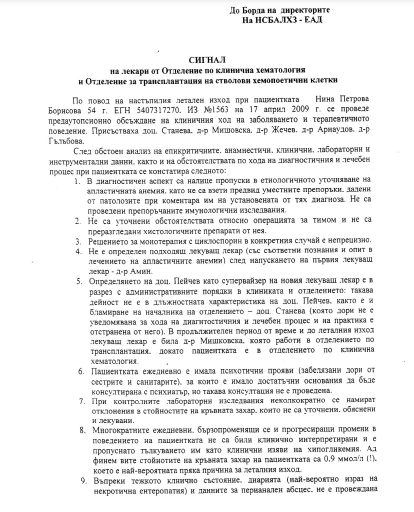 Видно от сигнала става ясно, че докато настоящият депутат от БСП е ръководител на отделението по трансплантация, от направените 36 трансплантации на стволови хемопоетични клетки, 35 са несполучливи. Лекарите изпращат писмото си и до Съвета на директорите на СБАЛХЗ-ЕАД-София, където уточняват, че през периода март 2005 г. до януари 2007 г., когато началник на отделението е д-р Георги Михайлов, са трансплантирани 35 пациенти, от които 35 са рецидивирали или починали.