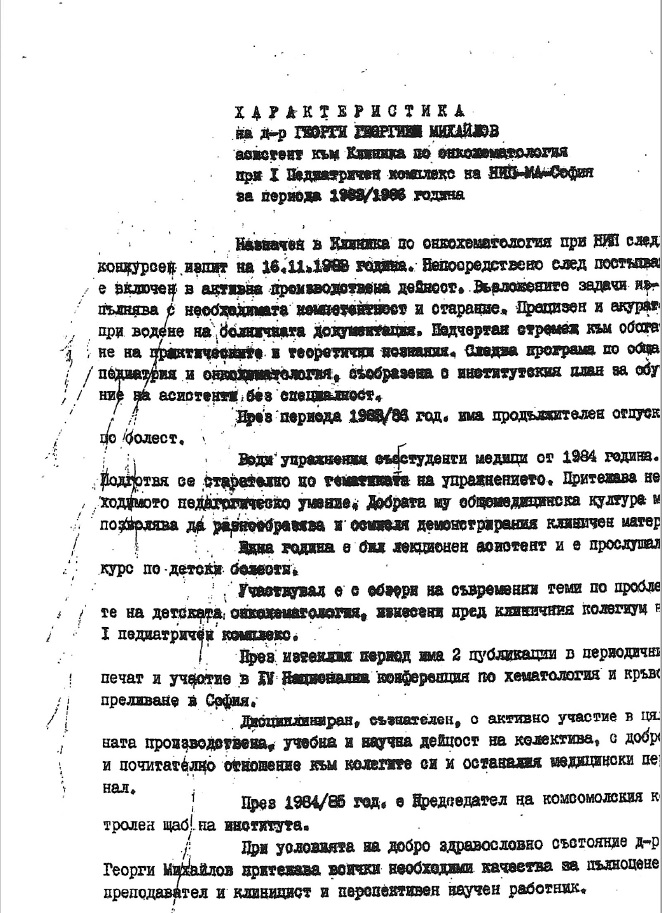 В писмата си до здравния министър лекарите алармират, че много уважавани техни колеги са напуснали болницата, като причината е свързана с поведението на Георги Михайлов. Според написаното в писмото той има дългогодишен проблем. Лекарите твърдят, че още като студент той страда от сериозно заболяване, което рецидивира, и когато е обострено му пречи да работи в детска клиника. Те цитират и протокол на Научно-учебен състав на Института по педиатрия от 1986 година, видно от който тогавашният ръководител на на клиника към Института по педиатрия - проф. Драган Бобев, уточнява в характеристиката за Михайлов, че притежава всички необходими качества на пълноценен преподавател, но само при условията на добро здравословно състояние.