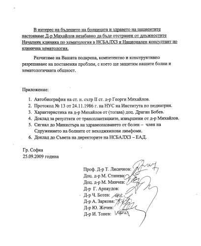 На 25.09.2009 г. 8 уважавани лекари от Националната специализирана болница за активно лечение на хематологични заболявания изпращат писмо до Божидар Нанев, в което го запознават с редите, нанесени от Георги Михайлов както на болницата, така и на мрежата по клинична хематология в страната.