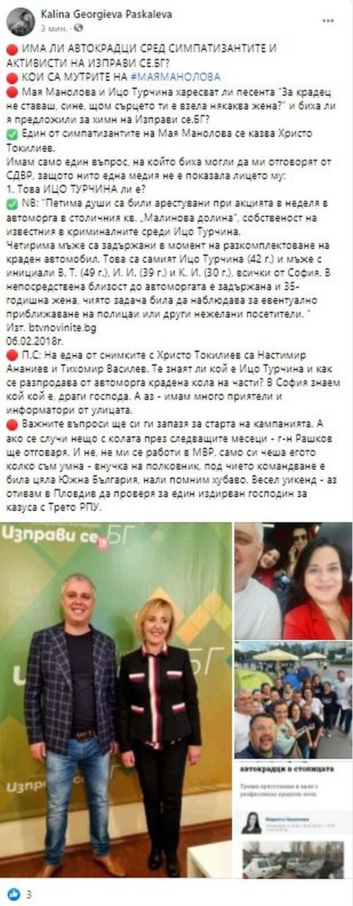 След което публикацията й продължава така: "Един от симпатизантите на Мая Манолова се казва Христо Токилиев. Имам само един въпрос, на който биха могли да ми отговорят от СДВР, защото нито една медия не е показала лицето му: Това ИЦО ТУРЧИНА ли е?", пита Паскалева.