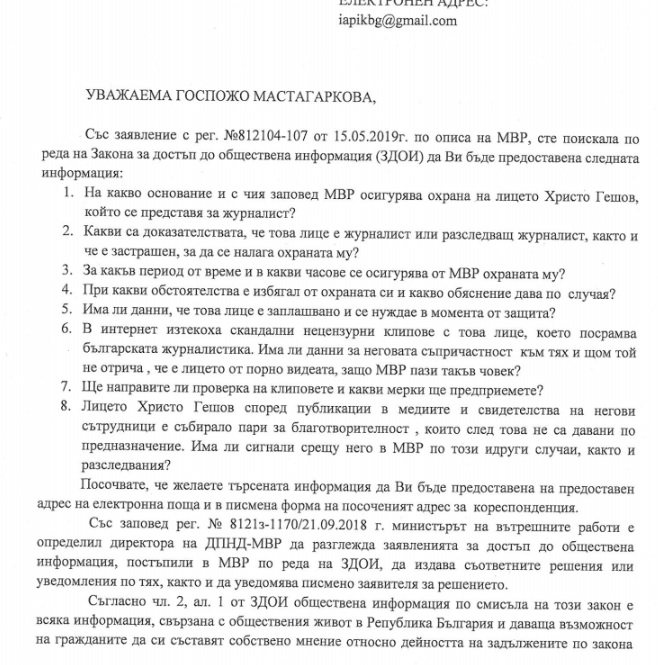 Министерство на вътрешните работи скандално отказа информация на ПИК по повод охраната на скандалното лице Христо Гешов, представящ се без никакво основание за журналист. С витиевати обяснения крият защо се хаби месеци наред обществен ресурс и човешка сила, за да се пази с пари на данъкоплатците подобен човек.