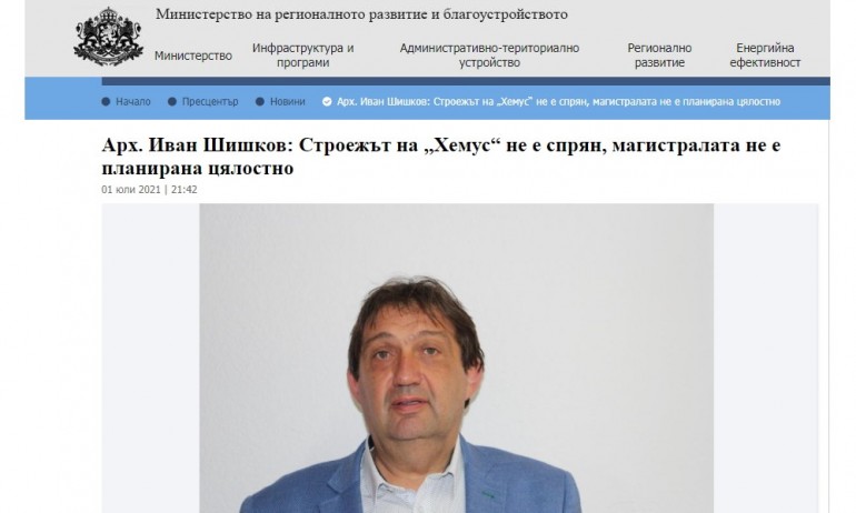 Строителството на АМ „Хемус“ не може да бъде спряно, защото не можеш да спреш нещо, което не е започнало. Това казал арх. Иван Шишков - съветник на министъра на регионалното развитие и благоустройството, в предаването  на Българска свободна телевизия „Студио Икономика” с водещ Нора Стоичкова.