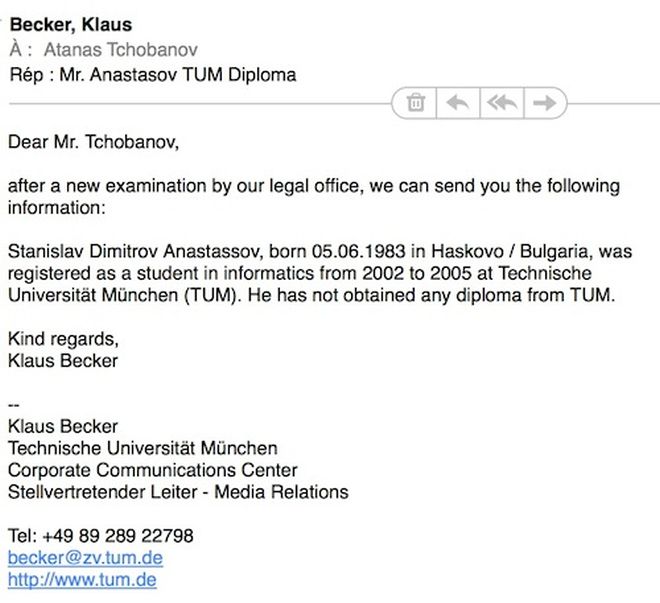 Станислав Анастасов е учил в Техническия Университет - Мюнхен (TUM) от 2002 до 2005 г. но не е получавал никаква диплома - това гласи официален отговор от Отдел комуникации на TUM, подписан от Г-н Клаус Бекер. Мейлът беше получен на редакционната поща на сайта, повече от месец след първоначалното запитване, пише bivol.bg.