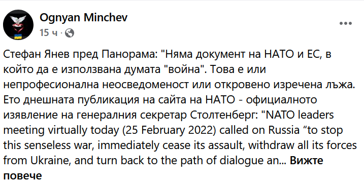 Огнян Минчев изобличи лъжата на военния министър Стефан Янев, че НАТО не използва формулировката "война" за нахлуването и агресията на руския президент Владимир Путин в Украйна.