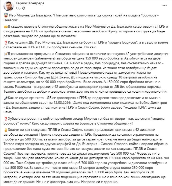 В същото време в Столична община хората на Иво Мирчев от "Да, България" се договарят с ГЕРБ и с подкрепата на ГЕРБ си пробутаха схема с екзотични автобуси. Ку-ку. Историята си струва да бъде разказана, защото по делата ще ги познаете.