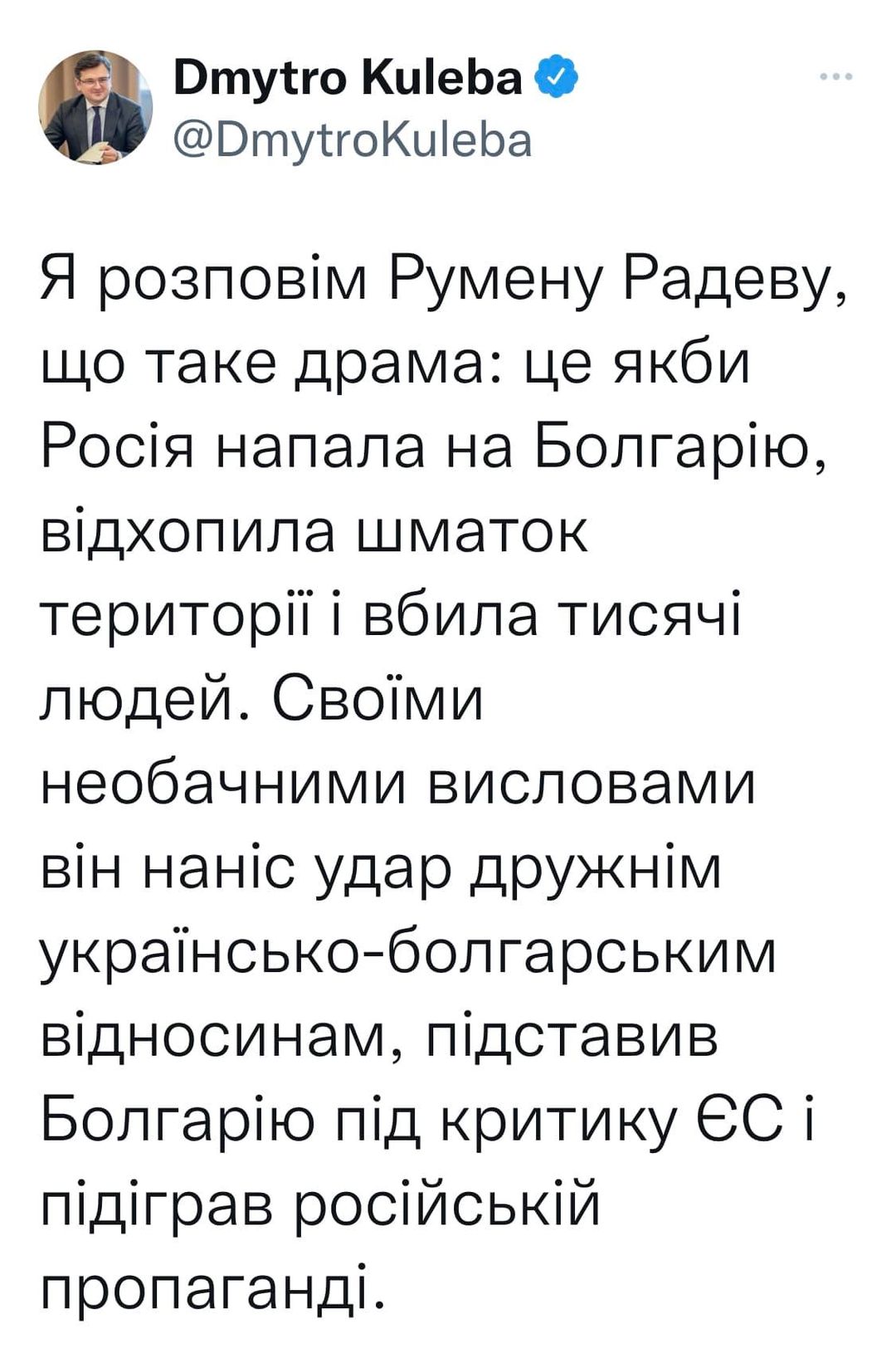 Украинският министър на външните работи Дмитро Кулеба коментира в Туитър думите на Румен Радев, че "няма драма" в изказването му, че "Крим в момента е руски", какъв да бъде":