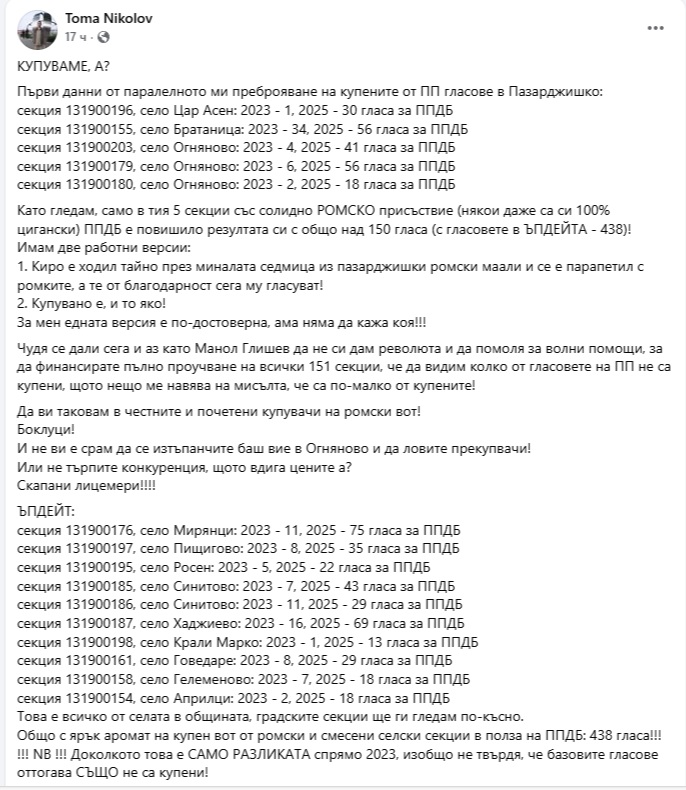 Припомняме, че и анализаторът Тома Николов разкри някои интересни факти около евентуалното купуване на гласове в Пазарджик.