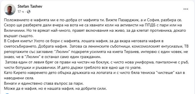 Може да е мафия, но е нашата мафия, на добрите сили", написа Ташев във Фейсбук.