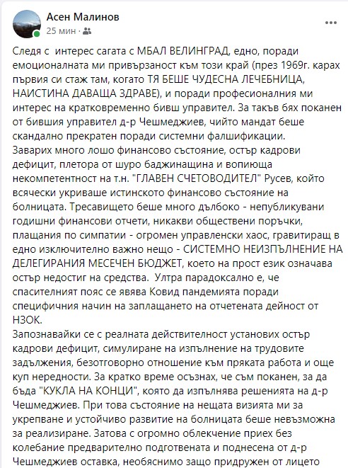 С тези думи на разочарование започва писмото си във фейсбук бившият управител на МБАЛ Велинград д-р Асен Малинов, заемащ поста само 2 месеца, по повод скандалните разкрития за източване на лечебното заведение през ковид средства, отстраненият му от Общинския съвет в града управител д-р Иван Динев заради злоупотреби и продължаващото управление в сянка на д-р Жеко Чешмеджиев – бивш управител на МБАЛ Велинград, отстранен от поста си след прокурорска проверка.