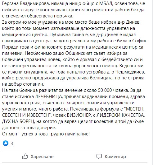 „Запознавайки се с реалната действителност установих остър кадрови дефицит, симулиране на изпълнение на трудовите задължения, безотговорно отношение към пряката работа и още куп нередности. За кратко време осъзнах, че съм поканен, за да бъда "КУКЛА НА КОНЦИ", която да изпълнява решенията на д-р Чешмеджиев. При това състояние на нещата визията ми за укрепване и устойчиво развитие на болницата беше невъзможна за реализиране. Затова с огромно облекчение приех без колебание предварително подготвената и поднесена от д-р Чешмеджиев оставка, необяснимо защо придружен от лицето Гергана Владимирова, нямаща нищо общо с МБАЛ, освен това, че нейният съпруг е изпълнявал строително ремонтни работи без да е спечелил обществена поръчка“.