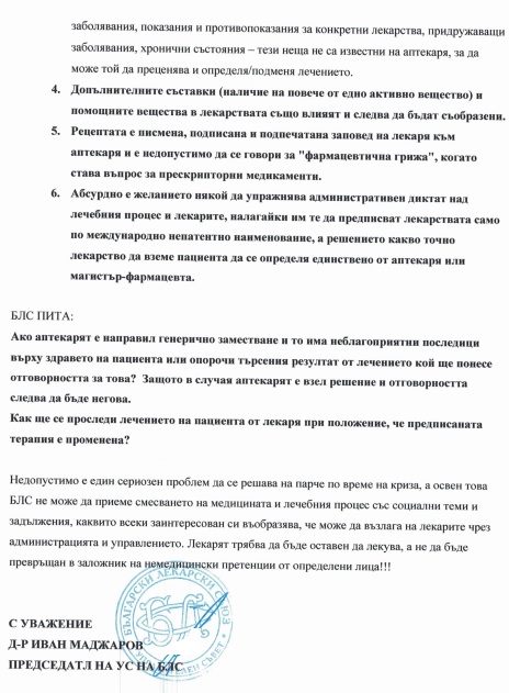 "Недопустимо е един сериозен проблем да се решава на парче по време на криза, а освен това БЛС не може да приеме смесването на медицината и лечебния процес със социални теми и задължения, каквито всеки заинтересован си въобразява, че може да възлага на лекарите чрез администрацията и управлението. Лекарят трябва да бъде оставен да лекува, а не да бъде превръщан в заложник на немедицински претенции от определени лица!", катеорични са медиците в декларацията на БЛС.