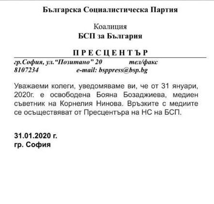 Официално съобщение от БСП за освобождаването на пиарката Бояна Бозаджиева бе разпратено до медиите. "Уведомяваме ви, че от 31 януари 2020 е освободена Бояна Бозаджиева, медиен съветник на Корнелия Нинова. Връзките с медиите се осъществяват от Пресцентъра на НС на БСП", се посочва в съобщението.
