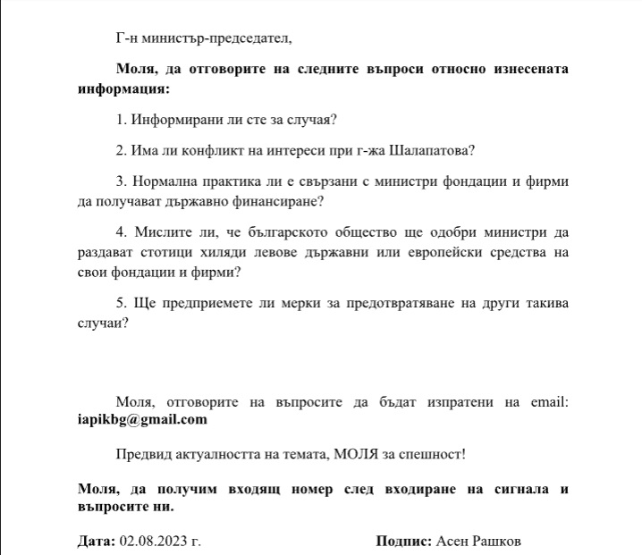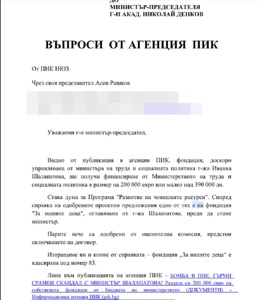 Агенция ПИК сигнализира за случая министър-председателя акад. Николай Денков и му изпрати ПЕТ въпроса.