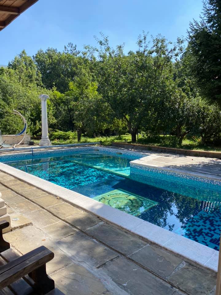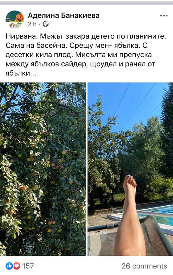 "Нирвана. Мъжът закара детето по планините. Сама на басейна. Срещу мен - ябълка. С десетки кила плод. Мисълта ми препуска между ябълков сайдер, щрудел и рачел от ябълки", пише в профила си майката от "Системата ни убива" и споделя и снимки от луксозния басейн в имота й.
