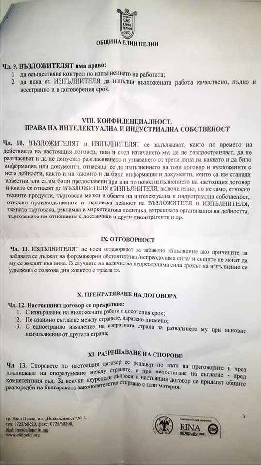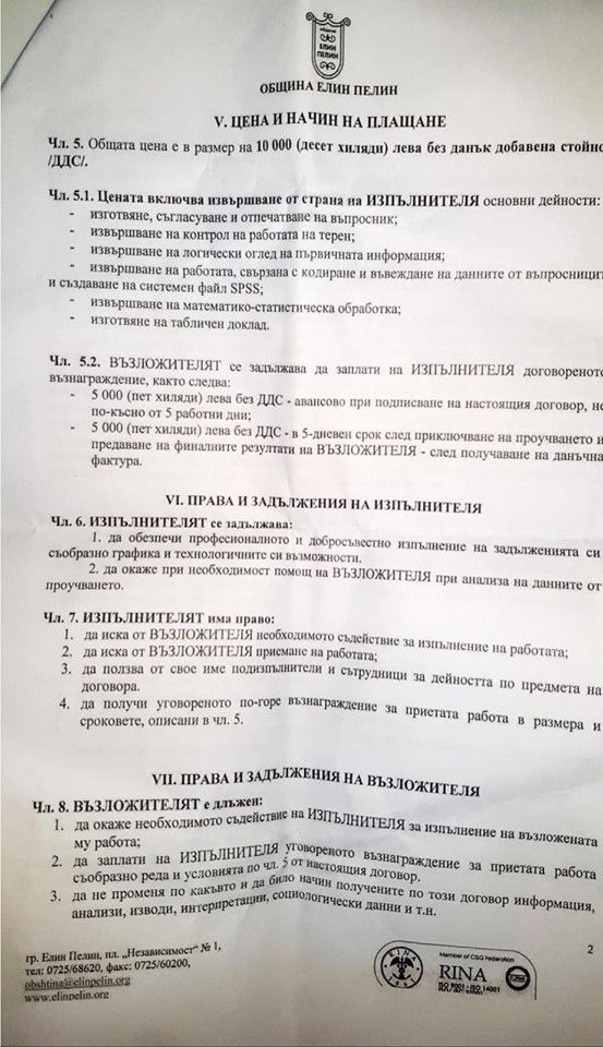 Договорът за 10-те хиляди лева е конфиденциален - никой никога не бива да узнава какво е мерено, защо е мерено и кому е било нужно това, което е отличен начин да се усвоят едни пари. Страните са се споразумели нито по време, нито след изтичането на договора да издават какво всъщност са подписали. Най-вероятно става дума за предизборни замервания на нагласите на елинпелинчани, но тогава отпускането на средствата става още по-скандално, тъй като настоящото ръководство на общината претендира за още един мандат и по този начин, давайки общински средства, играе само и единствено в своя полза и защитава партийни интереси, коментират запознати.